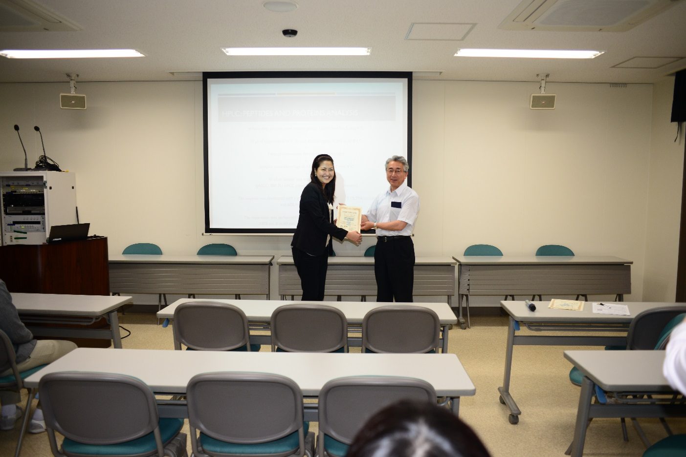 研究留学の受入れ先でありアドバイザーでもあるバイオサイエンス学科の荒木朋洋教授が司会を務め、英語での質疑応答も活発に行われました。終了後には、荒木教授から、博士に研究留学の修了証書が手渡されました。