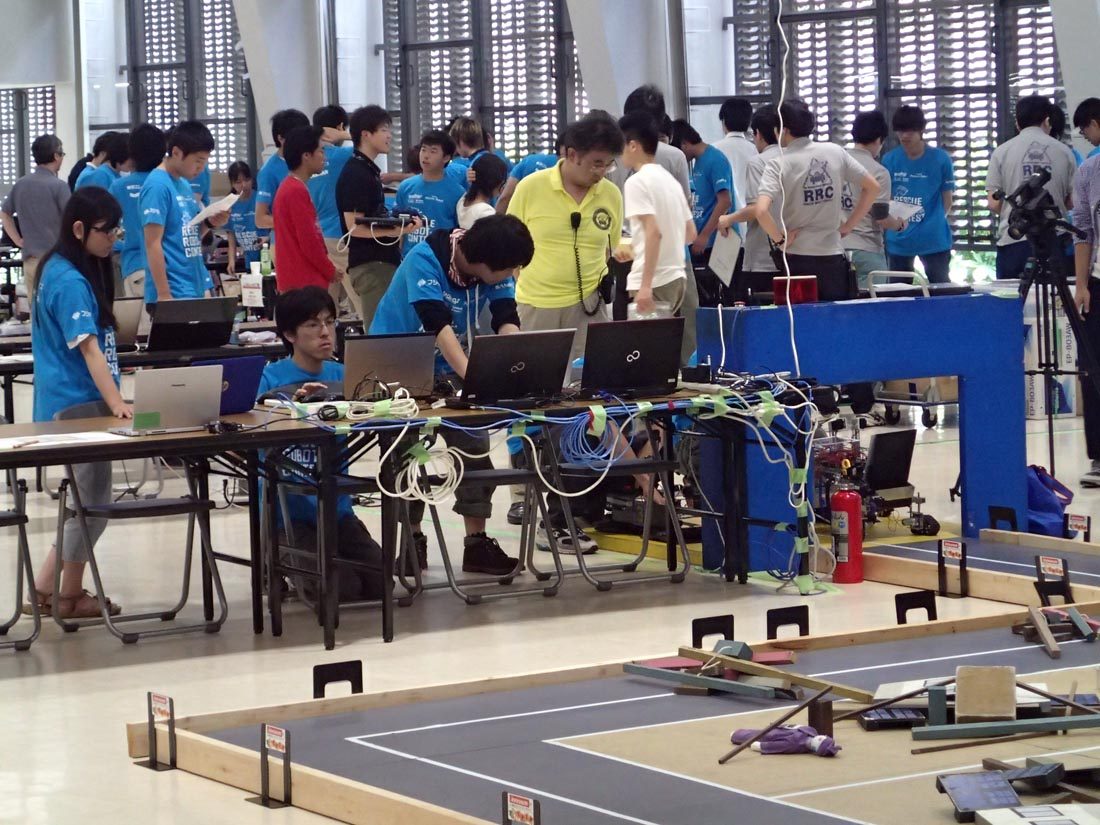 熊本キャンパスの基盤工学部生を中心に活動するチャレンジセンター「メカトロマイスター」が6月28日、神戸サンボーホールで開催された「第15回レスキューロボットコンテスト」(主催:同コンテスト実行委員会、神戸市、神戸サンボーホール)の神戸予選に参加しました。阪神・淡路大震災を契機にスタートしたコンテストで、レスキュー活動の大切さ、難しさを考えてもらおうと毎年開催されています。地震で倒壊した市街地を模した6分の1スケールの実験フィールド上の人形を、ロボットを遠隔操作して安全地帯に移動させ、その数やタイムなどを競います。