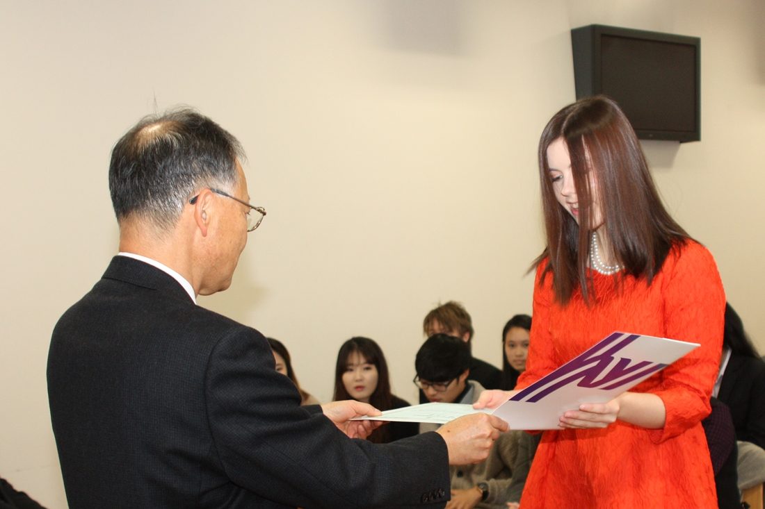 この秋セメスターで修了したのは、漢陽大学(大韓民国)13名、ハワイ東海インターナショナルカレッジ(アメリカ合衆国)3名、サイアム大学(タイ王国)3名、トゥルク大学(フィンランド共和国)2名、ベルゲン大学(ノルウェー王国)2名、ストックホルム大学(スウェーデン王国)2名、クイーンズランド大学(オーストラリア連邦)1名、清州大学(大韓民国)1名の計27名です。修了式にはキャンパスライフをともに過ごした留学生や教職員も出席し、研修生の修了を祝福しました。