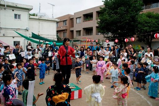 代々木キャンパス周辺の地域交流や活性化を目指して活動しているチャレンジセンター・ユニークプロジェクト「よょさんぽ」が、キャンパスに隣接する渋谷区立富ヶ谷保育園で7月5日に開催された夏まつりの運営をサポートしました。同保育園とは、よょさんぽの活動の一つであるはちみつプロジェクトや防災活動を通じて連携しています。これらの活動をきっかけに、松浦薫子園長から教員に夏祭りへの協力依頼があり、今回初めて7名の学生が保育園のイベント運営を手伝いました。当日は、保護者、教職員、学生たちが見守る中、園児たちは園舎や園庭でさまざまなゲームや映画を楽しんだほか、年長児がおみこしや踊りを元気よく披露しました。