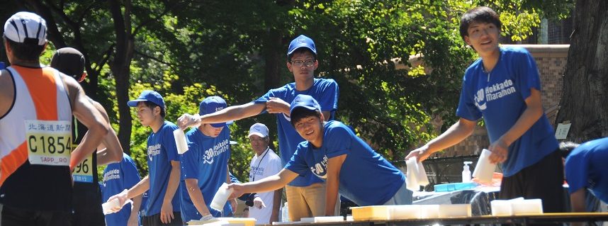 国際文化学部地域創造学科の学生が8月28日に札幌市内で開催された北海道マラソン2016で、給水ボランティアを行いました。本学科で開講する「地域創造フィールドワークA」の一環として毎年実施しているもの。この授業では札幌市内で開かれる各種マラソン大会で運営の裏方を経験し、競技者の気持ちを理解するとともに、選手を支える充足感を得ることで今後の学生生活や将来におけるスポーツとの向き合い方を考えるきっかけとすることを目的としています。今回の北海道マラソンでは、28名の学生と本学科の教員3名が参加しました。