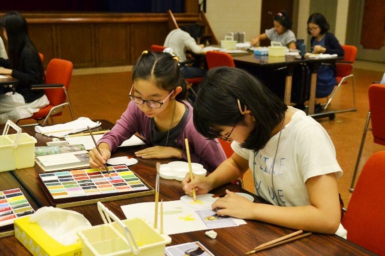昼食を挟んで、国立民族学博物館の広瀬浩二郎准教授が「資料に触ってみよう!」と題して講義。子どもたちはアイマスクをして南米の民芸品やおもちゃ、楽器などに触り、大きさや重さ、硬さ、質感、温度といった、見るだけではわからない民俗資料の面白さを体感しました。続いて、藤沢市アートスペースの小林絵美子学芸員が、天然の岩絵の具や胡粉(貝殻などをすりつぶした顔料)、膠(にかわ:動物の骨や皮で作られた接着剤)について説明し、日本画の描き方を実演。子どもたちは小林学芸員の指導や学生のサポートを受けながら、日本画の豆うちわづくりに取り組みました。最後に、鎌倉市鏑木清方記念美術館の今西彩子学芸員が掛軸の取り扱いや鑑賞方法について解説し、掛軸の歴史や季節に合わせた楽しみ方、日本の伝統文化を後世に残すことの大切さなどについても語りました。