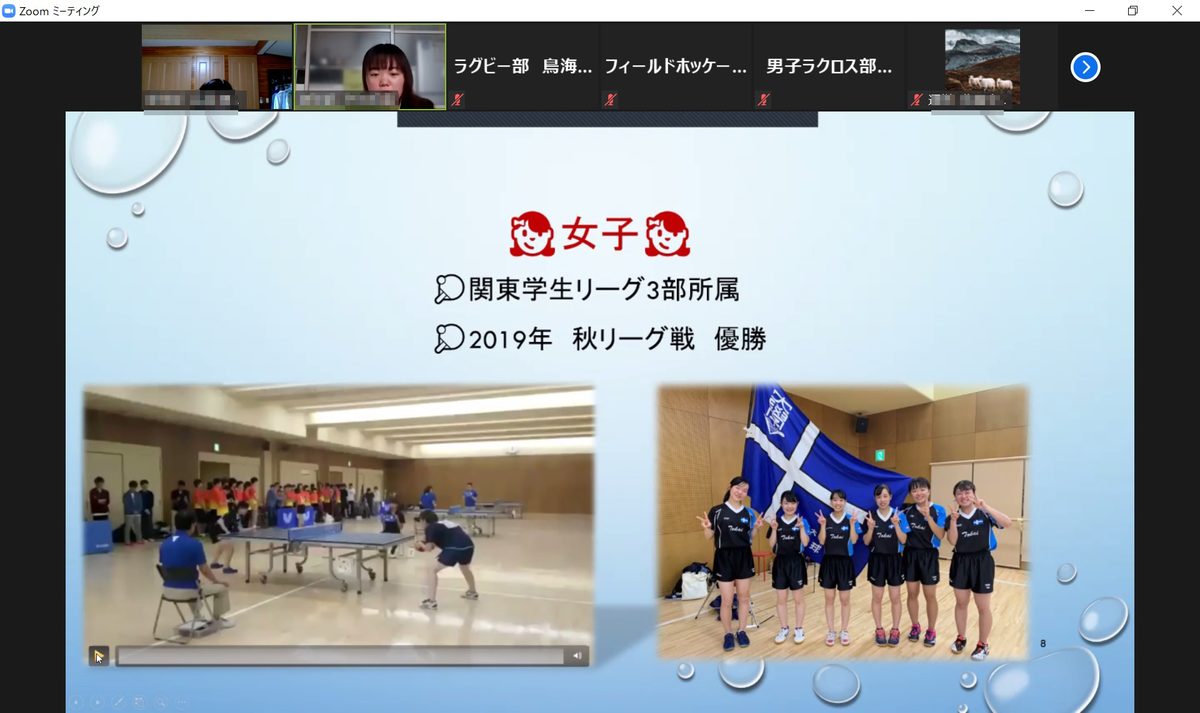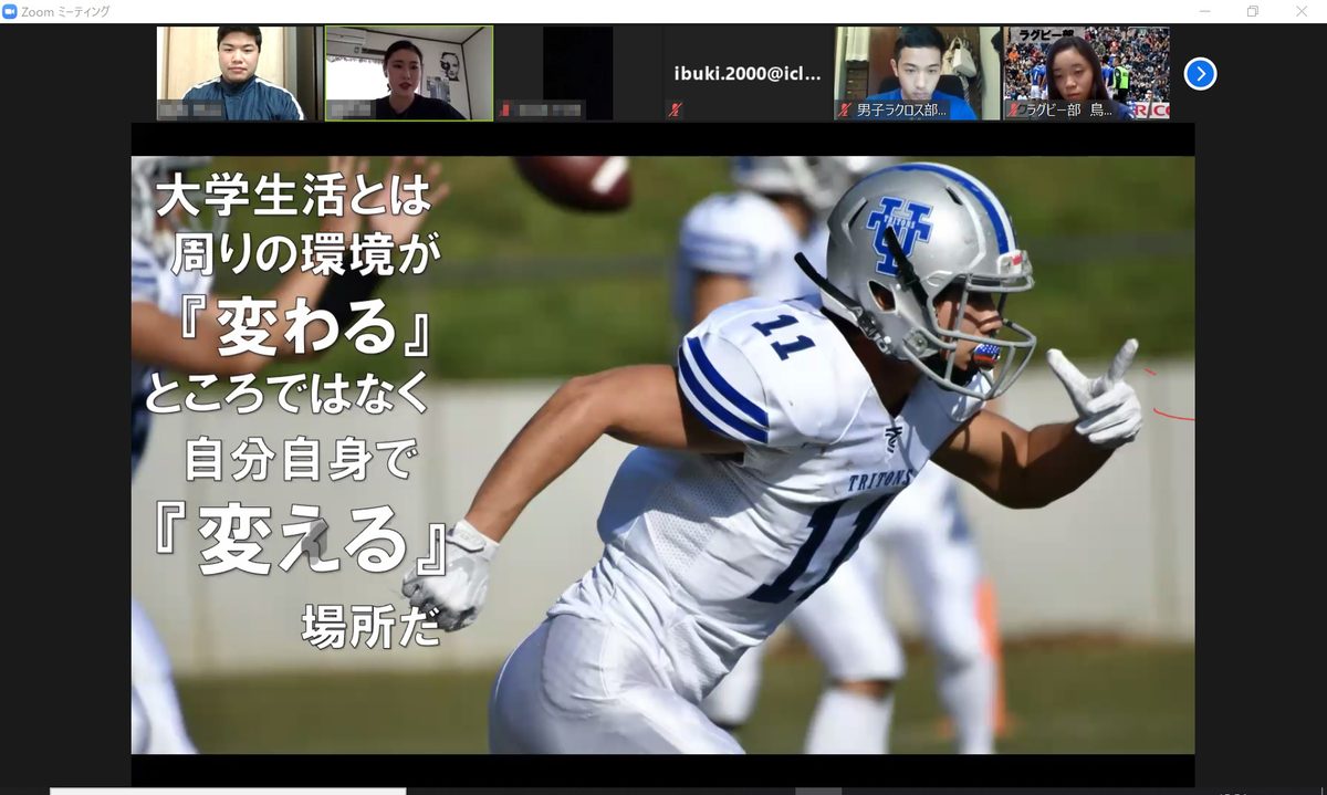 湘南キャンパスの運動部で構成する東海大学湘南校舎体育会の学生有志が、6月6日にオンライン会議システム「Zoom」を使った新入生説明会を開きました。本学では新型コロナウイルス感染症の拡大を防ぐため、学生のキャンパス内への入構を制限しています。体育会では、新入生の学生生活に向けた不安を取り除くとともに、それぞれの部の活動を知ってもらおうと初めて今回の催しを企画しました。