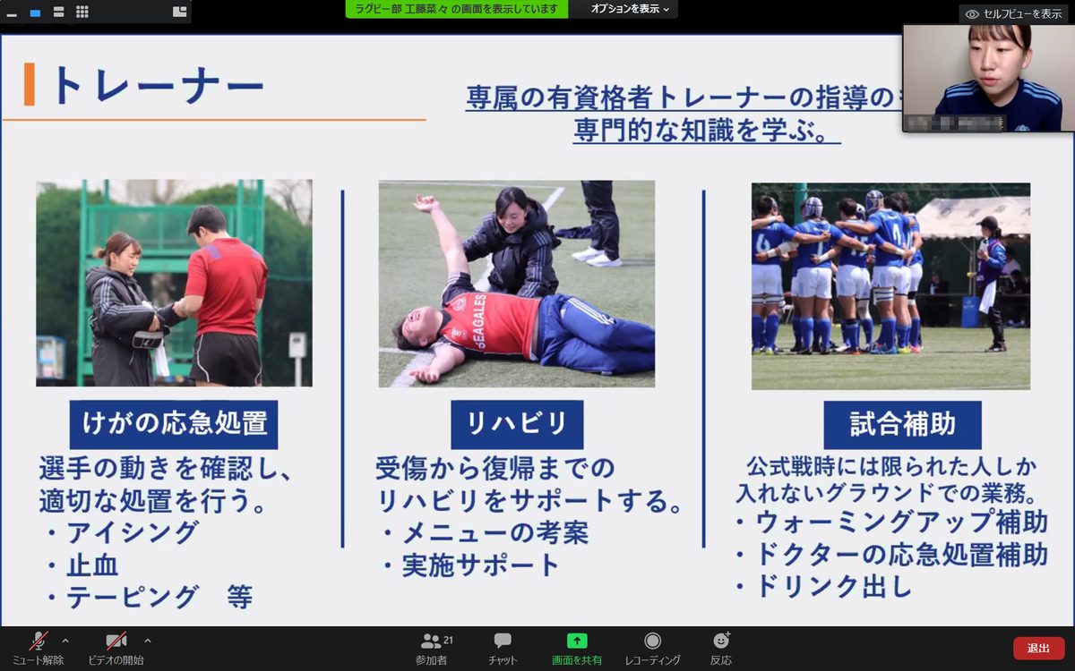説明会を運営したラグビーフットボール部マネジャーの鳥海菜々子さん(体育学部4年次生)は、「私はラグビー部のマネジャーとして活動できていることに日々幸せを感じています。新型コロナウイルス感染症の拡大によって、新入生が本来持つことができた目標ややりがいに出会えないのはもったいない。さらに新入部員が入らず今後の活動に支障が出るクラブが出てはいけません。今後も学生同士で協力していきたい」と話しています。