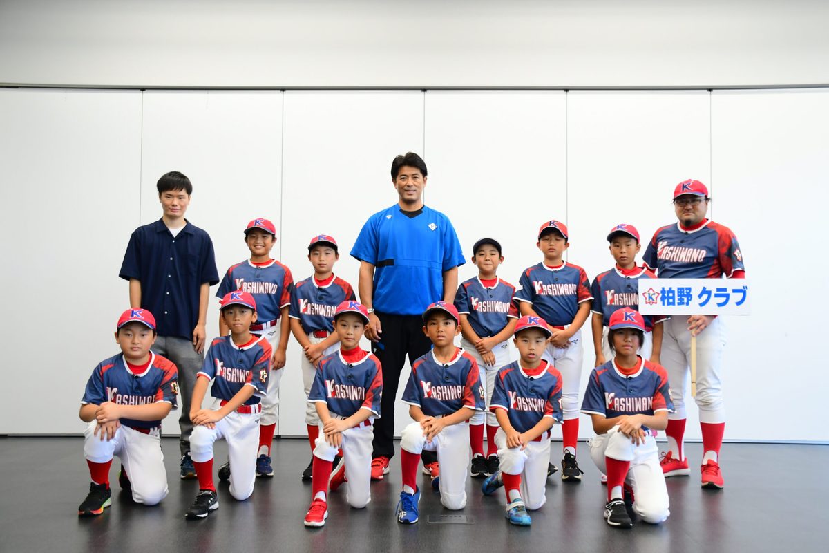 8月11日には、札幌ドームで柏野クラブのユニホームがお披露目され、中心になってデザインに取り組んだ本学科4年次生の東泰文さんが出席。ファイターズの稲葉篤紀GM兼SCOも駆けつけ、完成したユニホームを身に着けた柏野クラブの子どもたちと東さんとともに記念撮影が行われました。