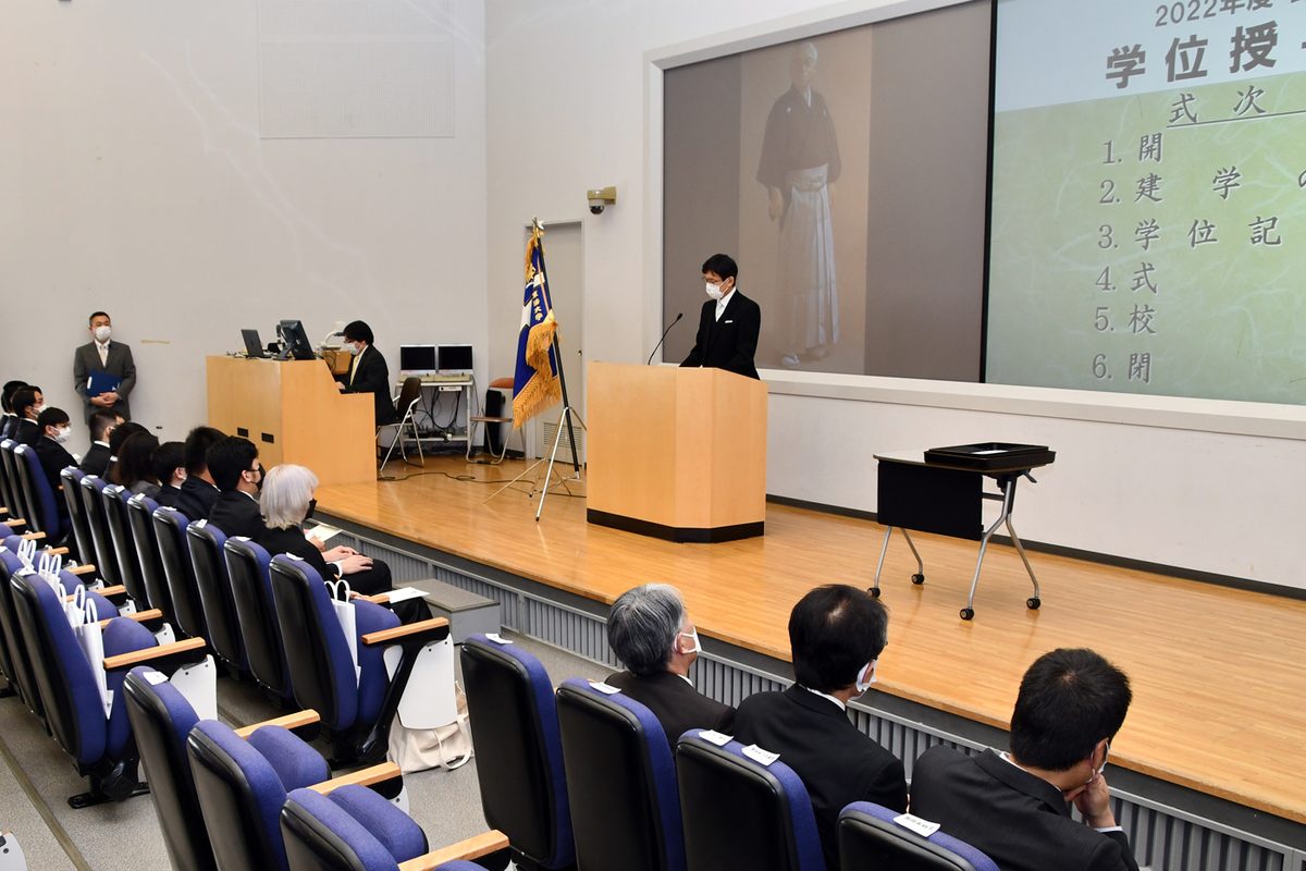 当日は、建学の歌に続いて、出席した学生に網野真一札幌キャンパス長が学位記を授与しました。続いて網野キャンパス長が卒業生に向けて、創立者・松前重義博士が掲げた本学建学の思想や本キャンパス設置の経緯などを紹介し、「本学を卒業する皆さんには、母校の歴史を胸に刻み、希望高く前に進んでいただきたいと思います。ただ、それでも社会で行き詰ってしまった場合は、また東海大学に来てください。皆さんが学んだ校舎、教室を訪れた後には、必ず新たな活力が湧いているはずです。我々教職員は皆さんを応援します」とエールを送りました。