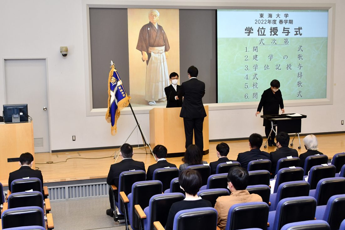 当日は、建学の歌に続いて、出席した学生に網野真一札幌キャンパス長が学位記を授与しました。続いて網野キャンパス長が卒業生に向けて、創立者・松前重義博士が掲げた本学建学の思想や本キャンパス設置の経緯などを紹介し、「本学を卒業する皆さんには、母校の歴史を胸に刻み、希望高く前に進んでいただきたいと思います。ただ、それでも社会で行き詰ってしまった場合は、また東海大学に来てください。皆さんが学んだ校舎、教室を訪れた後には、必ず新たな活力が湧いているはずです。我々教職員は皆さんを応援します」とエールを送りました。