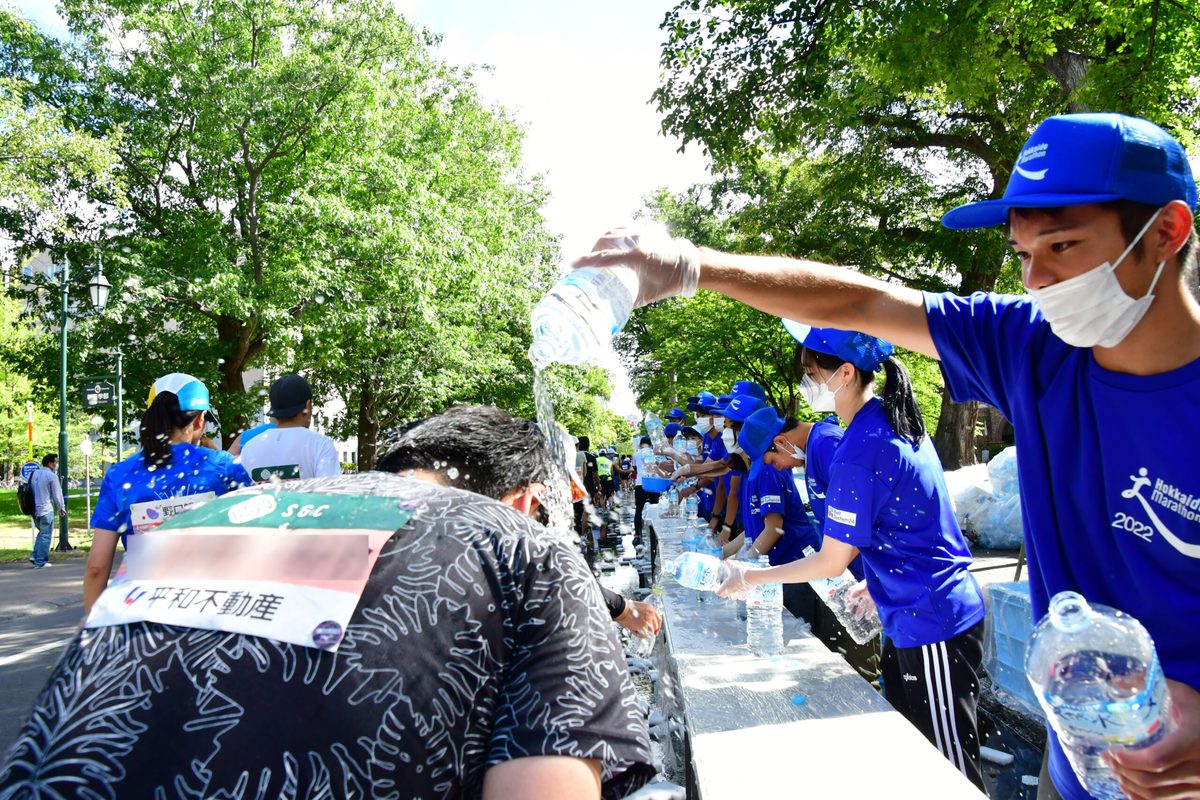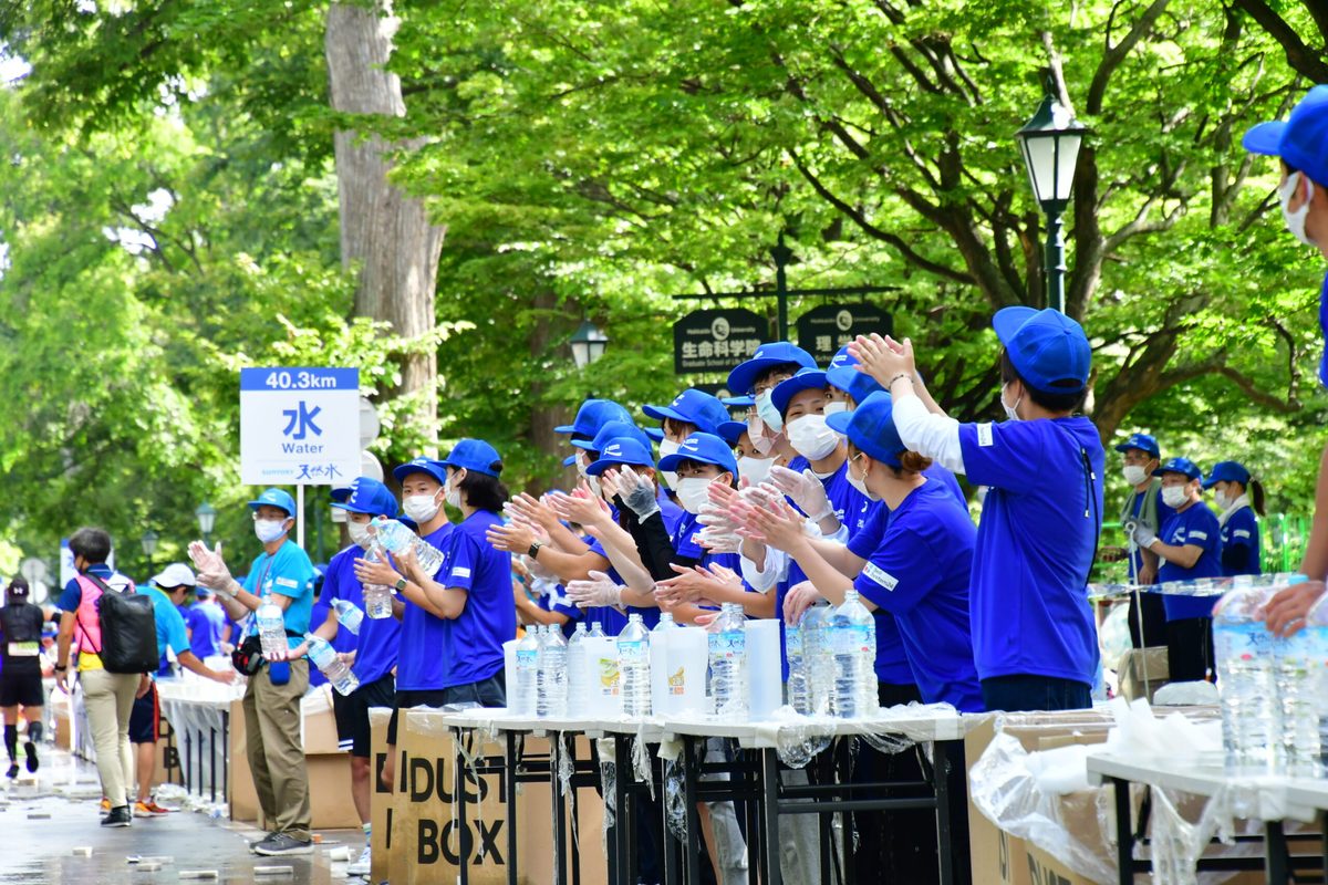 今回のボランティア活動には、1年次生から3年次生まで約20名の学生と本学科の教員2名が参加。26日、27日には札幌市・大通公園に設けられた参加者受付でゼッケンの配布を担当し、参加者が二次元コードをリーダーに読み取る手助けをしながら、エントリーナンバーを書き取り、後部に用意されたゼッケンを探して手渡すまでの一連の作業に手分けして取り組みました。28日の大会当日は、40km地点に設けられた給水ポイントで配布されるスポンジの用意を担いました。大きなバケツに水と氷を満たし、スポンジに冷たい水を含ませてテーブルに並べ、ランナーが到達するとマスク越しに「頑張れ!」「あと2km!」とエールを送りながら次々とスポンジを配布。足りなくなったスポンジを用意したり、並べたり、使い終わって道路上に投げ捨てられたものを回収したりと休みなく作業にあたりました。当日は気温が上がったこともあり、ランナーたちは積極的に紙コップに入った水やスポンジを手に取り、学生たちに「ありがとう!」「ボランティアの皆さんも頑張って」と声をかけていました。