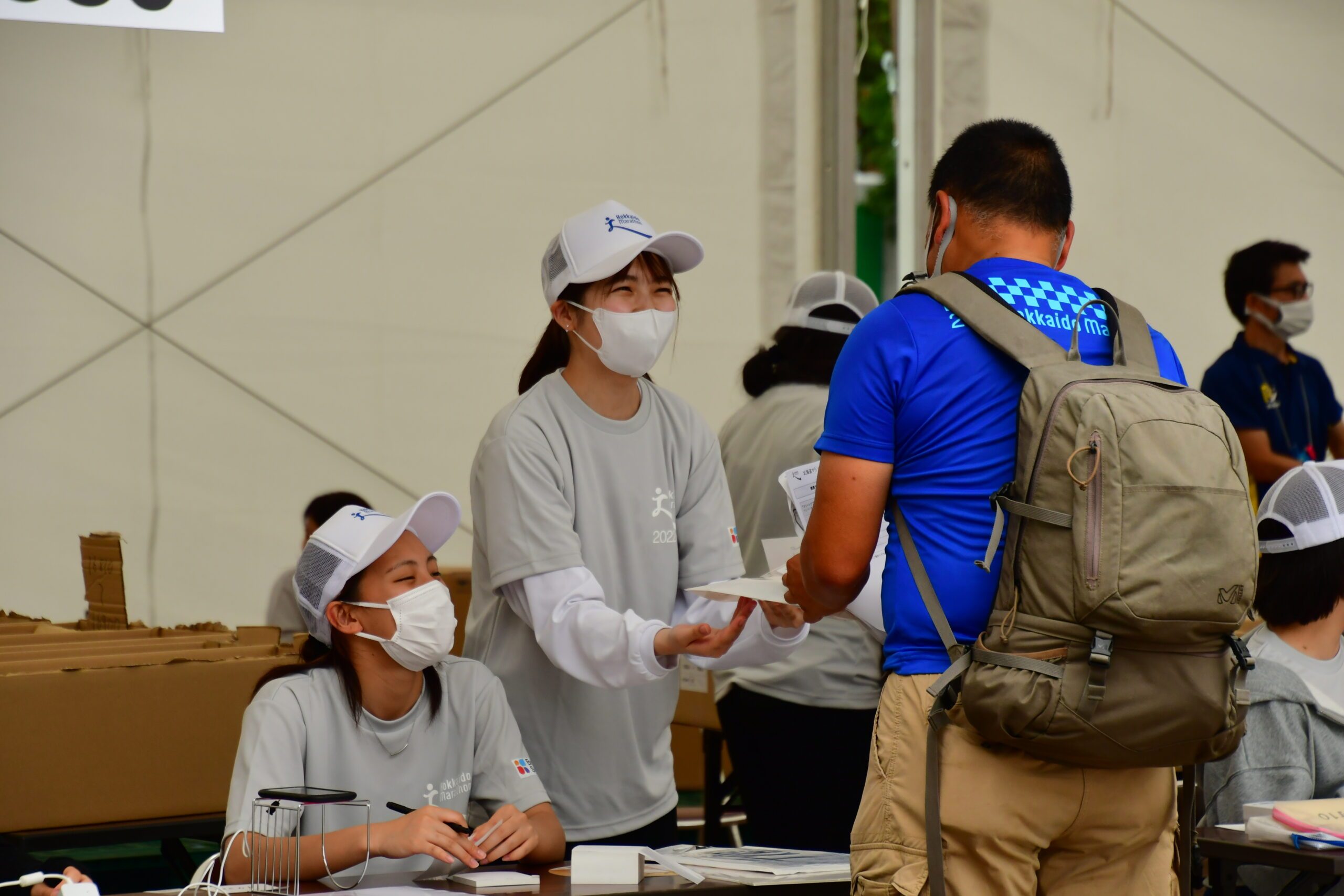 今回のボランティア活動には、1年次生から3年次生まで約20名の学生と本学科の教員2名が参加。26日、27日には札幌市・大通公園に設けられた参加者受付でゼッケンの配布を担当し、参加者が二次元コードをリーダーに読み取る手助けをしながら、エントリーナンバーを書き取り、後部に用意されたゼッケンを探して手渡すまでの一連の作業に手分けして取り組みました。28日の大会当日は、40km地点に設けられた給水ポイントで配布されるスポンジの用意を担いました。大きなバケツに水と氷を満たし、スポンジに冷たい水を含ませてテーブルに並べ、ランナーが到達するとマスク越しに「頑張れ!」「あと2km!」とエールを送りながら次々とスポンジを配布。足りなくなったスポンジを用意したり、並べたり、使い終わって道路上に投げ捨てられたものを回収したりと休みなく作業にあたりました。当日は気温が上がったこともあり、ランナーたちは積極的に紙コップに入った水やスポンジを手に取り、学生たちに「ありがとう!」「ボランティアの皆さんも頑張って」と声をかけていました。