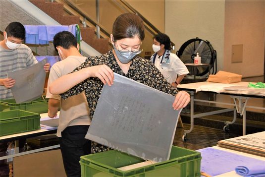 川崎市民ミュージアムとの連携事業「被災資料レスキュー」では、2019年に発生した台風19号の被害で収蔵品の一部が浸水してしまった水損紙資料の洗浄や乾燥などの復旧作業に協力。同ミュージアムで学芸員を務める谷拓馬氏と菊地悠介氏が被災後からこれまでの経緯や洗浄作業の工程などの説明をした後、学生たちは和紙などをはじめとした紙資料を洗浄しました。紙資料を2枚の網で挟み、水を張った容器の中で付着している汚れやカビなどを除去し、吸水シートで水気を拭き取った後に資料を扇風機で乾燥させました。学生からは「資料を濡らすことにかなり抵抗がありましたが、被災資料を扱う機会はなかなかないので貴重な経験になりました」「洗浄中には独特の臭いが感じられた」といった声が聞かれました。
