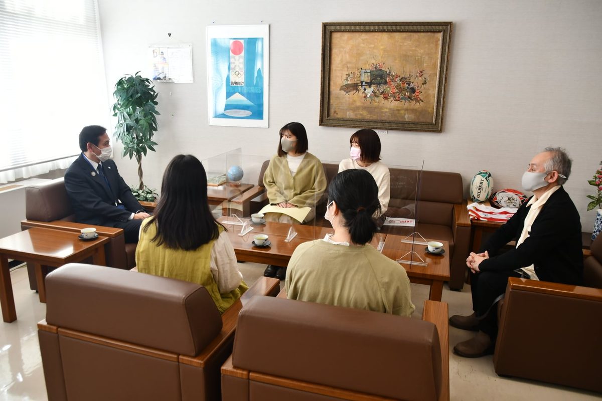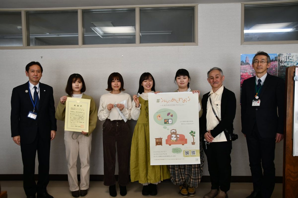 札幌キャンパスで活動する東海大学チャレンジセンター・ユニークプロジェクト「地域連携プロジェクト」が、2月26日に札幌市南区から感謝状を授与されました。同プロジェクトは、国際文化学部デザイン文化学科の学生を中心に活動しており、2011年度から南区の魅力を伝えるフリーペーパー『SAN+(サンプラス)』を発行しています。しかし、昨年4月から秋にかけては新型コロナウイルス感染症の拡大を受け、取材活動を自粛。その間もメンバーたちは、これまでお世話になった方々や区民の力になろうと5月から11月にかけて区内でテイクアウトができる飲食店を紹介する特設サイトを運営する独自企画「♯うちであじわおう?札幌市南区応援プロジェクト?」を展開しました。今回の感謝状は、これらの活動が評価されたもので、当日はメンバー4名に南区の大平英人区長から賞状が手渡されました。