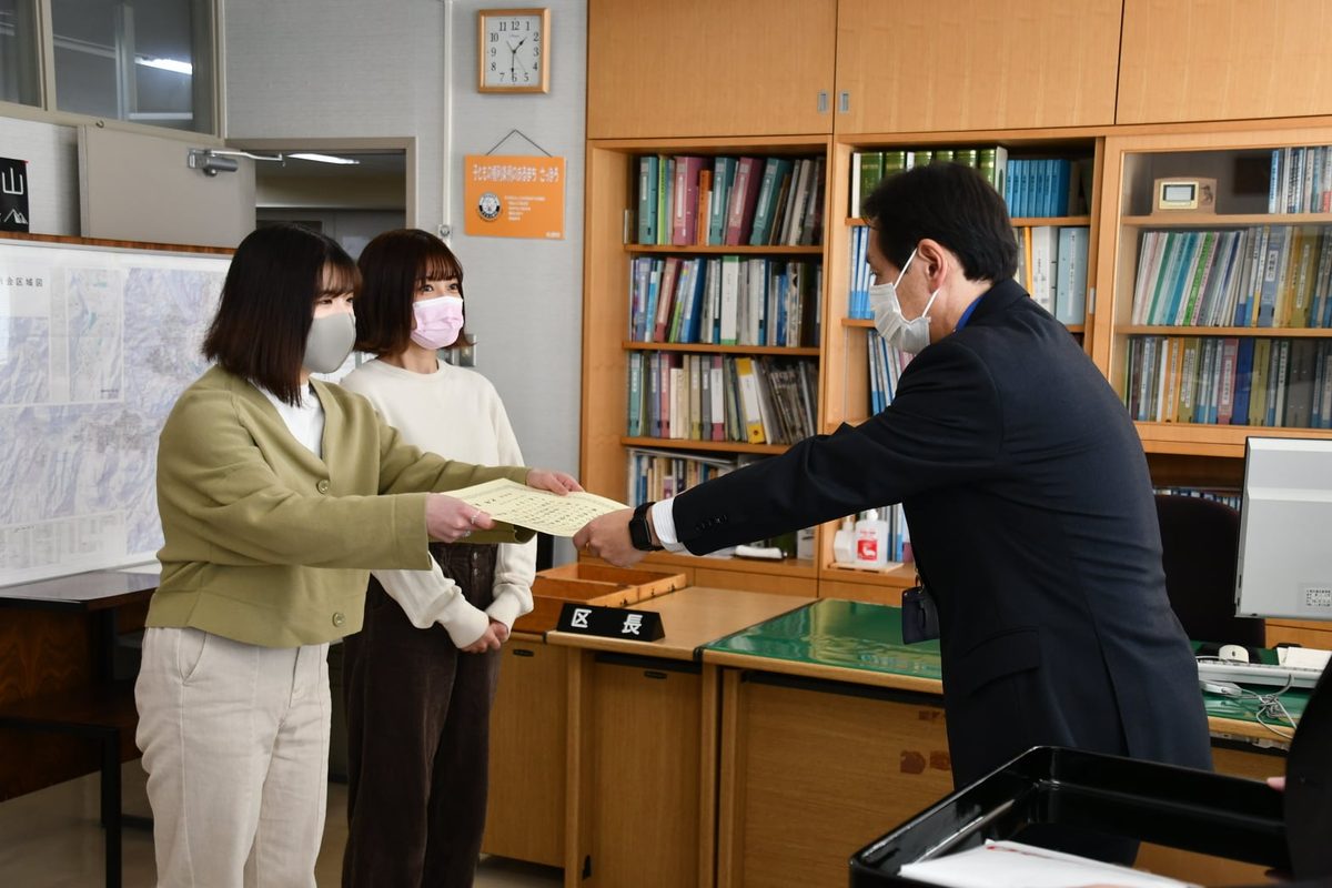 メンバーたちはサイト運営に向けて4月からオンラインで準備を開始。過去に取材した店舗などを中心に情報収集を進め、5月からサイト運営を開始。SNSでも情報を発信するとともに、随時掲載できる店舗を募集し、約半年の活動期間内に48店舗の情報を紹介しました。メンバーの村上綾菜さん(3年次生)は、「これまでのように南区内各所に足を運んで取材活動ができない中でも、地域に貢献できることがあるのではないかと考え活動してきました。感謝状をいただけるとは思ってもいなかったので驚きましたが、今後の活動への励みになります」と笑顔で語り、広報用のポスターをデザインした平沢摩阿椰さん(2年次生)は、「デザイン文化学科で学んだ知識を生かして、ポスターを見てくれた人にも取り組みやサイトの内容が伝わりやすいよう工夫しました。多くの店舗を紹介することにもつながり、少しは地域の方々の力になれたと感じています」と振り返りました。