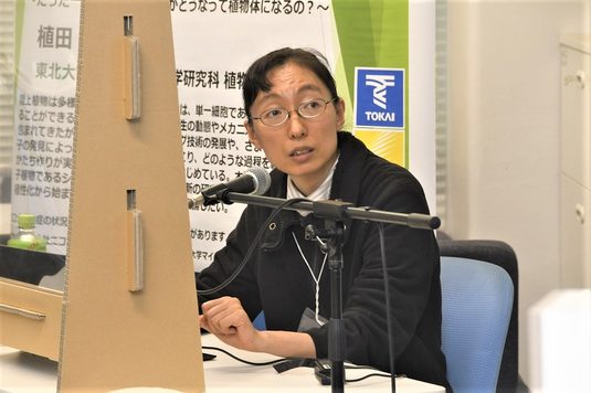 植田氏は、「植物の受精を起点とする個体発生動態やメカニズムは長く謎に包まれてきましたが、近年のライブイメージング技術の発展やさまざまな制御因子の発見によって、受精卵の内部で何が起こり、どのような過程を経て植物のかたちづくりが実現するのかが分かり始めています」と説明。被子植物のシロイヌナズナを例に、研究で得られた受精卵の極性化から始まる体軸形成の仕組みを、さまざまな映像や資料とともに紹介しました。「今後は、マイクロ・ナノ研究開発センターでナノ寸法の高分子ナノ薄膜について研究されている岡村陽介教授(工学部応用化学科兼務)と連携して研究の進展を図っていきます。今日の講演会がさらなる研究発展の契機になれば」と話しました。