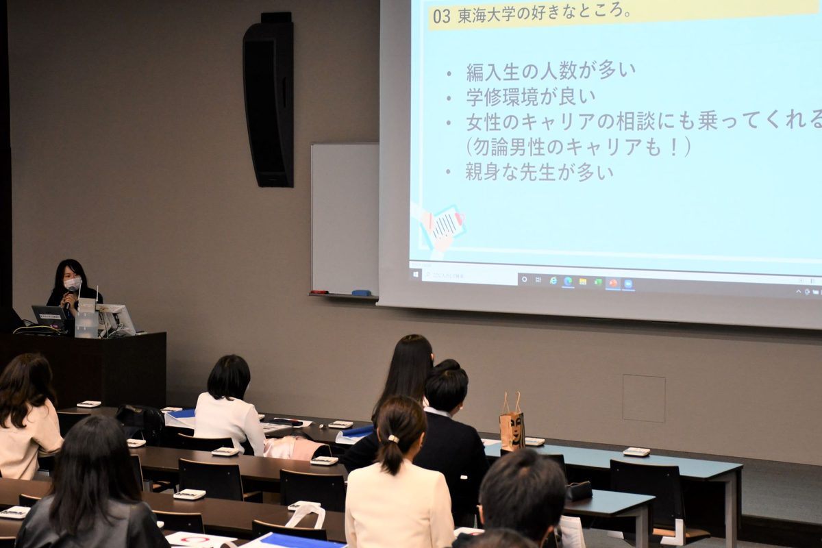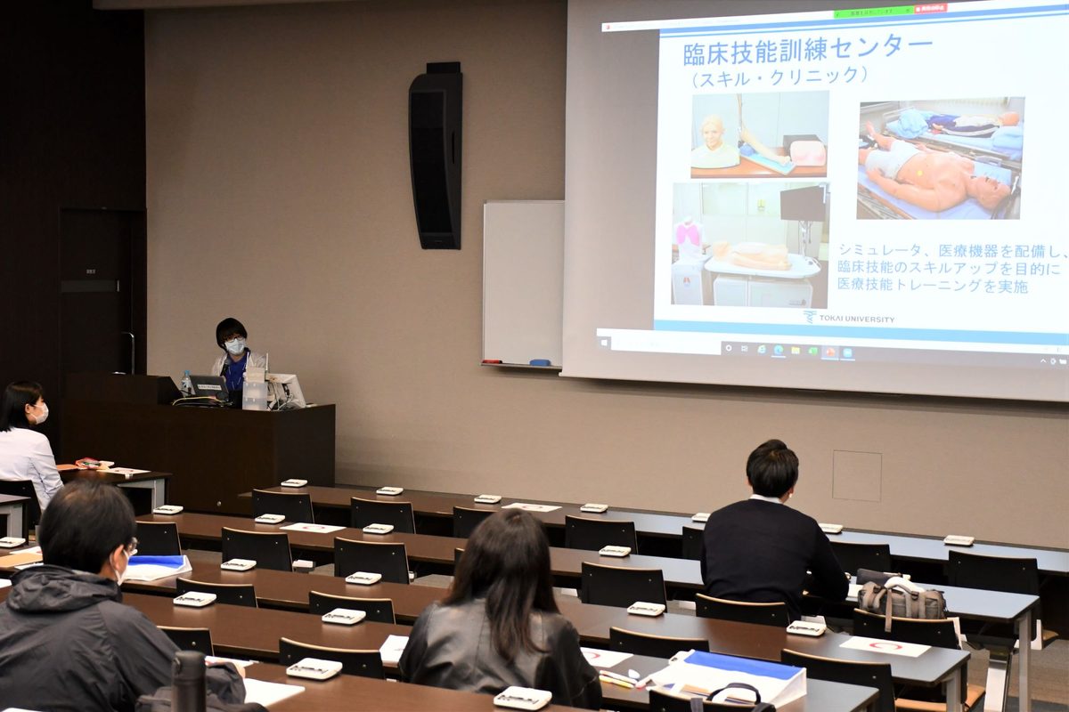 続く「学生トークライブ」では、5年次生の大谷真由良さんがキャンパスライフや合格体験談を紹介。「製薬会社のスタッフとして訪問した医学部付属病院で尊敬できる先生方に出会ったことが、編入学を目指したきっかけです。勉学はもちろん、ライフイベントに応じたキャリアプランニングの相談にも親身に応じてくれるなど教職員の方々のサポートが厚く、ロールモデルになる先輩も大勢います。学年をこえた編入生の交流も魅力。ぜひ一緒に東海大で学びましょう」と語りかけました。「バーチャルキャンパスツアー」では6年次生の中島伸さんが、医学科生が主に利用する教室やコンピューター室、図書館、臨床技能訓練センターといった施設について画像を見せながら紹介。「最新の医療設備や機器が整った医学部付属病院で実習ができるのもメリット。医師になるための学習環境が整っています」とアピールしました。