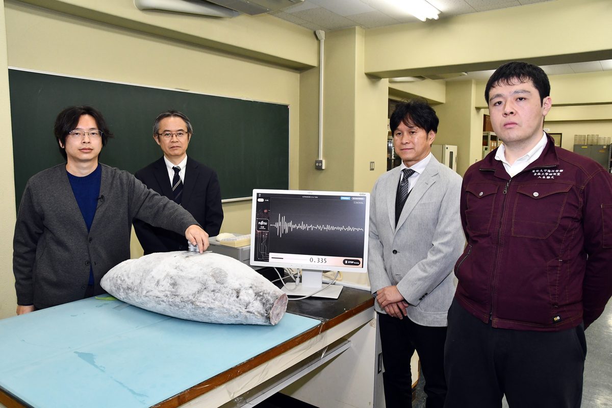 海洋学部水産学科の後藤慶一教授がこのほど、富士通株式会社との共同研究で、冷凍マグロの重要な品質指標の一つである鮮度について、超音波AI技術を活用することで冷凍状態のまま非破壊で評価することに世界で初めて成功。12月21日に静岡キャンパスを拠点に、オンラインも併用して報道陣向けに研究成果の説明会を開きました。