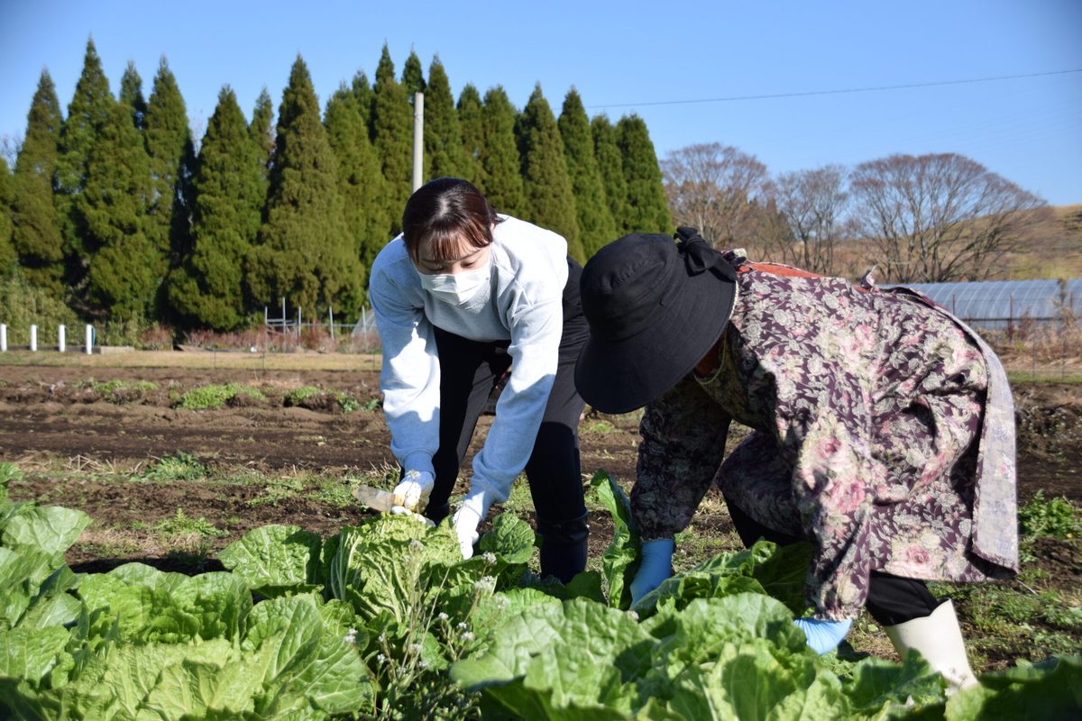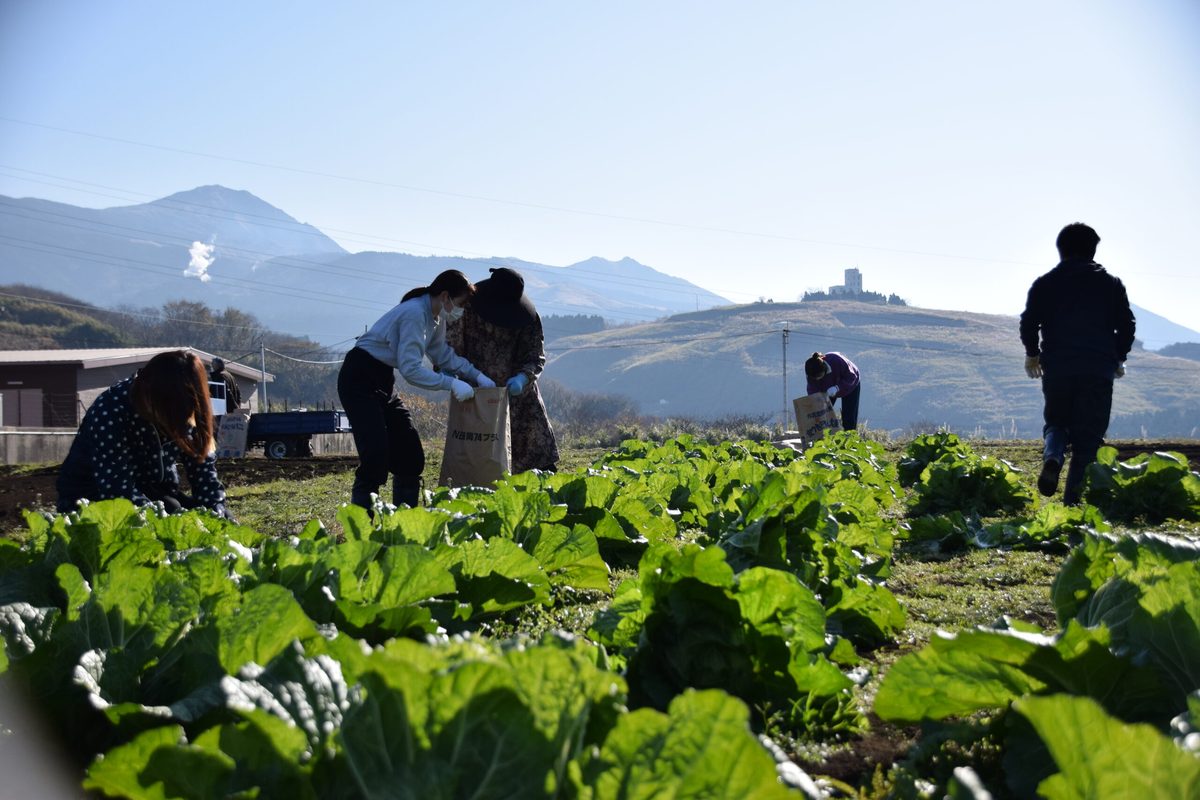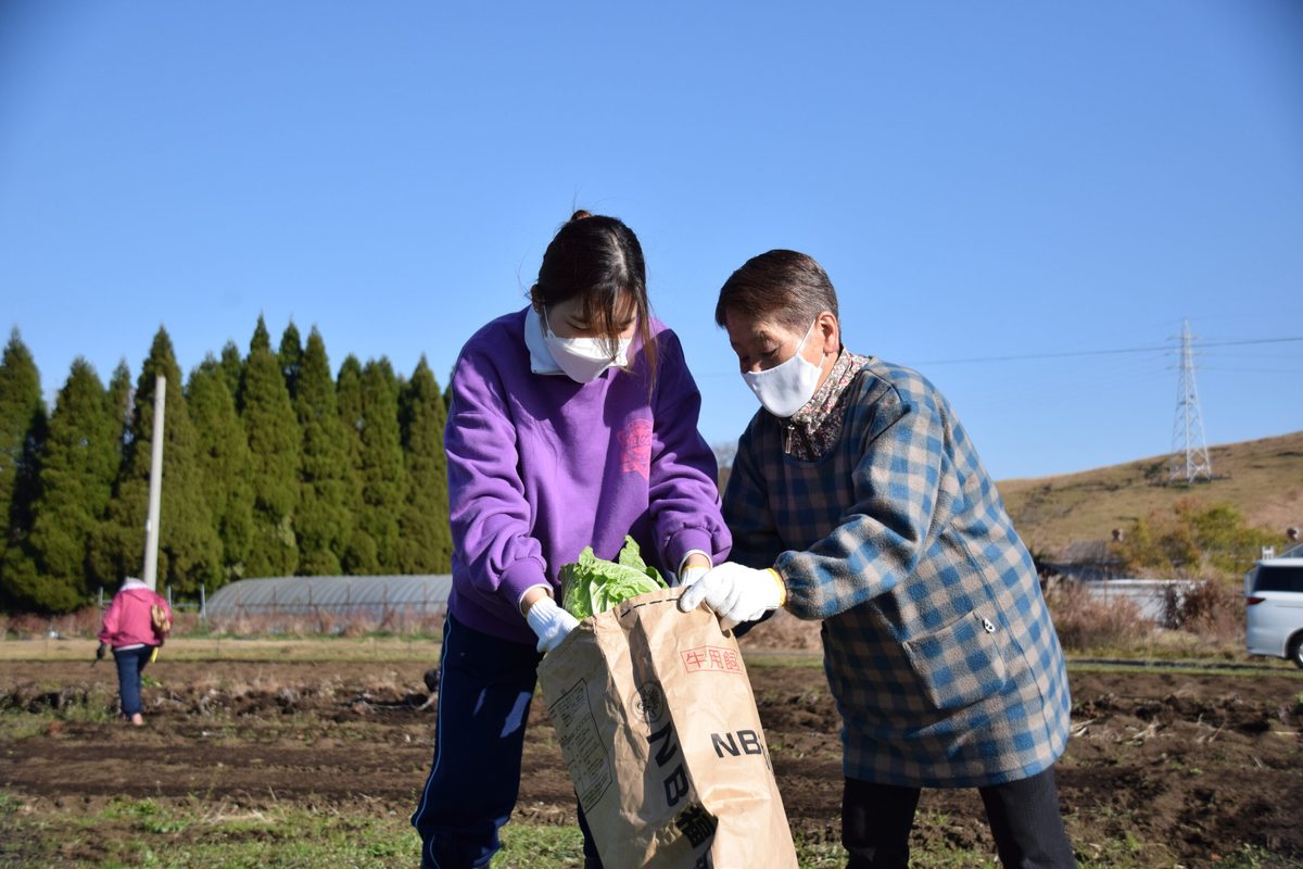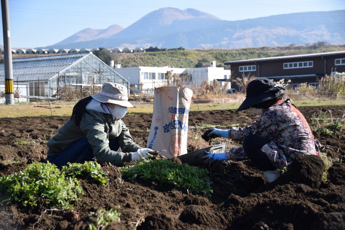 本学では2018年1月に、環境省ならびに熊本県と「阿蘇地域の創造的復興に向けた地域循環共生圏の構築に関する協定」を締結しており、熊本地震に見舞われた阿蘇地域の創造的復興に向けて、さまざまな取り組みを展開しています。そのなかで今回は、12月10日に阿蘇実習フィールドにおいて「黒川地区住民と学生との農産物収穫」を開催しました。