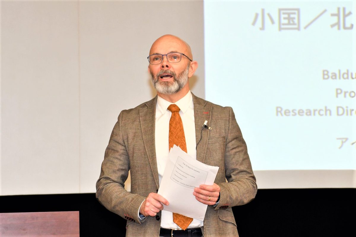 トールハルソン教授は初めに、ノルウェー、スウェーデン、デンマーク、フィンランド、アイスランドの北欧諸国について人口やGDP、軍事力などの概要と、ヨーロッパ各国との比較、小国であるためのウィークポイントについて紹介。北欧モデル(The Nordic Model)と呼ばれる、「成熟した議会制民主主義」や「オープンな民主的政府」「競争力のある市場経済」「包括的な福祉国家」「厳格な環境基準」「強固な防衛」など特徴ある価値観や制度について解説し、「これらを支えているのは人権や女性の権利尊重に加えて、ナショナルアイデンティティとともに北欧であることへのアイデンティティもあります。さらに、これに矛盾しない国際主義の考え方も持っており、北欧理事会を組織し、域内パスポート協定を結び、域内共通労働市場を形成するなどユニークで独特な協力関係を築いています」と語りました。