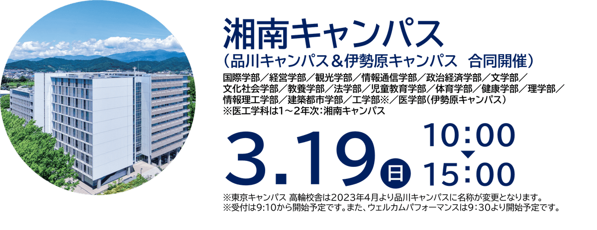 湘南キャンパスの11学部&品川キャンパスの5学部&伊勢原キャンパスの医学部(医学科と看護学科は分かれて説明)が学部ごとに分かれて、特色などを紹介します。