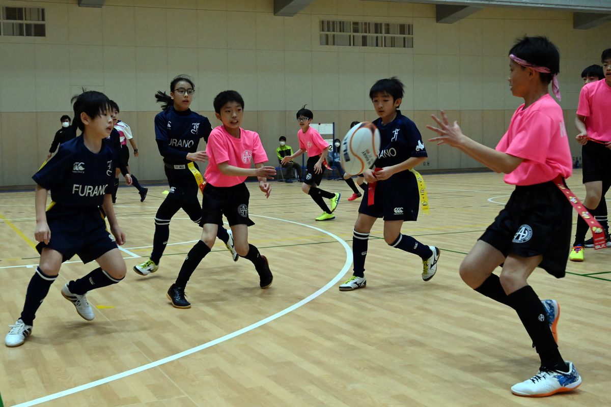 札幌キャンパスの第1体育館「TOKAI ARENA」で3月5日に、「東海大杯全道小学生タグラグビー大会」(主催:一般財団法人 北海道ラグビーフットボール協会)が開催されました。タグラグビーは、タックルなどの接触プレーがないため安全性が高いとして小学校の体育の授業にも取り入れられています。2019年のラグビーワールドカップ日本開催以降、小学生の競技人口が増え、各地の代表チームが集まる全国大会も開催されています。本大会は、全道の小学生へのラグビー普及を目指す北海道協会から、室内での開催が必須となる冬季に全道大会を開きたいとの要請を受けて実現したもので、バレーボールコート3面分の広さを持つ「TOKAI ARENA」を会場として提供しました。また、本キャンパスラグビー部監督の海藤晃弘准教授(生物学部生物学科)とコーチの鈴木大准教授(同)ら教職員とボランティアの学生も運営に協力しました。