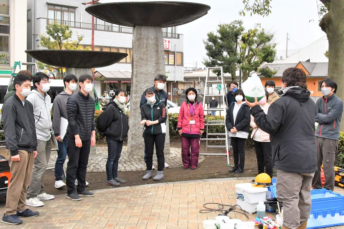 当日は、TQCの篠原聰准教授がイベントの趣旨を説明した後、参加者は北口広場内に設置されている横山徹作「風景の器」と中岡慎太郎作「MY FAMILY」、植松奎二作「浮くかたち―赤」の3つの作品の汚れや傷を確認。専用の洗剤やブラシ、高圧洗浄機を使って汚れを落としました。参加者した学生は、「わずか数時間の作業でここまできれいになるとは思いませんでした。洗浄前と作品の雰囲気が変わったように感じる」「実際に取り組むことで、メンテナンス活動の重要性を心から理解することができた」と話していました。秦野市文化スポーツ部文化振興課の米津朱理氏は、「メンテナンスを通して彫刻に触ることで、座学だけでは得られない経験ができると思います。秦野市内にはまだまだ屋外彫刻作品があるので、今後もメンテナンスに市民が関わる機会を増やしていきたい」と語りました。