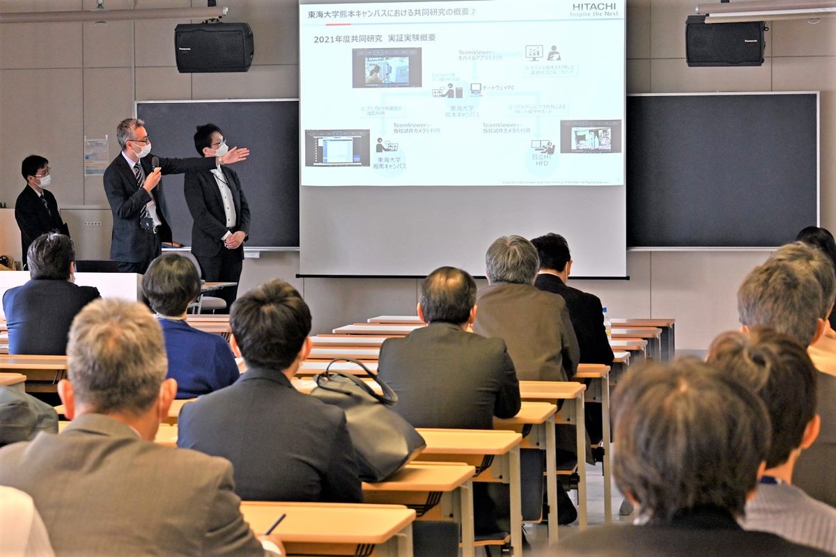 全体会では稲津敏行副学長(理系担当)が開会のあいさつに立ち、「コロナ禍で研究に関する対面での評価や交流は中断されていましたが、こうしてさまざまな分野の研究者が一堂に会して成果を報告し、会話することで、分野を融合した研究のスタートになるのではないかと期待しています。ぜひ新たな研究の芽をつくっていただきたい」と語りました。続いてユニバーシティビューローの岩森暁ゼネラルマネージャー(研究推進担当・総合科学技術研究所所長)が日立ハイテクと締結した協定の概要を説明し、「ぜひ積極的にご活用いただき、課題や希望をお寄せください」と呼びかけました。その後は日立ハイテクフィールディング経営企画本部の天願潤氏が、1997年から熊本校舎で行ってきた共同研究や、遠隔システムの概要を説明。21年度には、湘南校舎から熊本校舎のゲートウェイパソコンに接続し、アミノ酸分析装置を遠隔利用する共同研究を実施したことも報告し、遠隔利用で取得したデータをクラウド上で管理する「ExTOPE」の使い方も解説しました。また、同社サービス企画本部の加藤一幸氏とキャンパスサポートオフィス技術共同管理室の小田慶喜技術員が、遠隔利用の具体的な方法やメリットなどを語りました。質疑応答では活発な議論が繰り広げられ、天願氏は、「熊本校舎で一定程度の効果を得られました。装置の利活用を促進し、研究活動の効率化・品質向上、遠隔データの活用による装置使用性の向上などに資するよう取り組んでいきたい」と話しました。