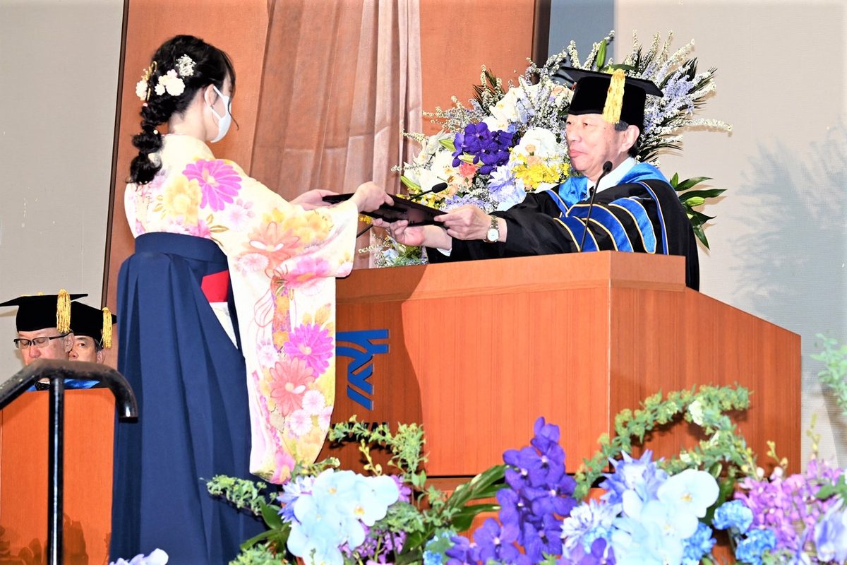 24日の大学院生を対象とした式は、2号館大ホールで実施。山田清志学長から学位記を、各研究科長からメダルを授与しました。25日は総合体育館を会場に、各学部の総代に山田学長が学位記を手渡し、総長賞受賞者の代表に髙野二郎副総長から表彰状が、各学部長から記念品が授与されました。両日ともに式辞では山田学長が英語でスピーチしました※。