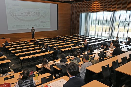 式には、学校法人東海大学の松前義昭理事長、東海大学の山田清志学長、木之内均九州キャンパス長ら教職員をはじめ、在学生を代表して九州学生会の髙本祐翔会長(経営学部2年次生)、熊本県の蒲島郁夫知事、益城町の西村博則町長、本学卒業生で全国町村会長を務める嘉島町の荒木泰臣町長ら多数の来賓、工事関係者らが出席。初めに地元・杉堂地区の氏神である津森神宮から神職を招いて神事を挙行し、続いて2号館エントランスでテープカットを行いました。祝賀会では、松前理事長が学園を代表してあいさつし、地元自治体や地域住民、工事関係者らへの感謝を述べました。工事報告に続いて蒲島知事が、県の営業部長兼しあわせ部長であるくまモンと共に登壇し本学や農学部への期待が語られたほか、山田学長も謝辞に立ち、熊本地震からの創造的復興に向けた取り組みを振り返りました。終了後にはキャンパスの見学会も行い、関係者が農学部の岡本智伸学部長ら教職員の案内で来場者が最新の教育研究施設や、旧阿蘇校舎以来つないできた貴重な標本資料の保管状況などを視察しました。