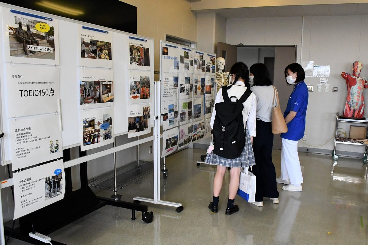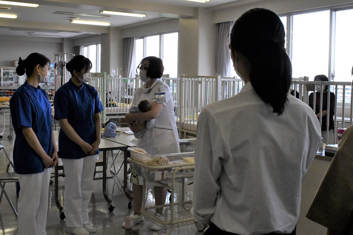 看護学科の「学科説明&入試説明」は松前記念講堂で実施。科学的・論理的思考と適切な看護技術の体得、多職種連携によるチーム医療の実践といった教育目標をはじめ、取得できる資格やハワイ、デンマーク、アメリカ(メイヨクリニック)での海外研修制度、卒業後の進路、各種入学試験制度、奨学金制度などについて学科長が説明しました。3号館の看護実習室にブースを設置して実施した「看護師とのフリートーク」「教員と個別相談」「看護学科生とフリートーク」では、新型コロナウイルス感染症対策や仕事のやりがい、入試対策、演習や実習などについて参加者が熱心に質問する姿が見られました。「演習見学」の企画では、実習室を使用して教員と学生がベビー人形を用いた小児看護の模擬演習を行い、多くの参加者が訪れていました。