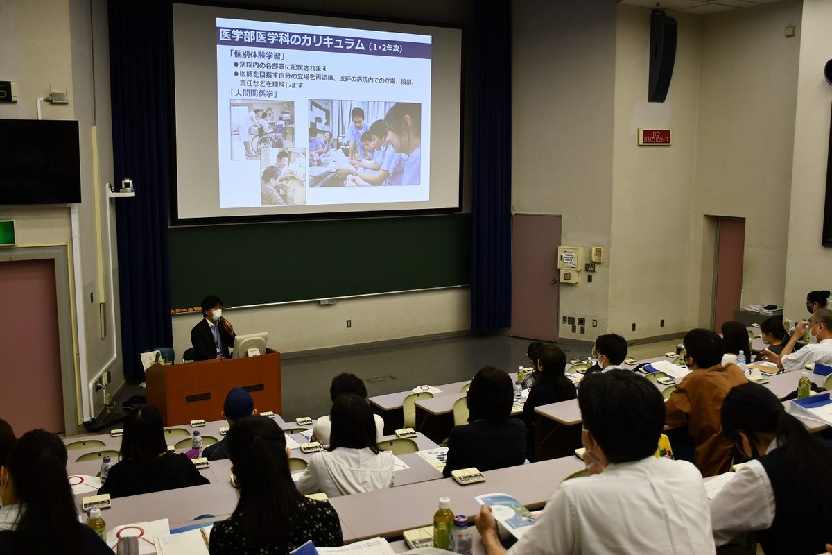 1号館講堂で実施した医学科の「学科説明&入試説明」では、少人数で能動的に学ぶ問題解決型学習や最先端の医療を提供している医学部付属病院でのクリニカルクラークシップ(診療参加型臨床実習)、多彩な海外留学・海外研修制度といった、人間性豊かな「良医」を育成するための教育について、入試・広報担当者が紹介。2022年度の各種入学試験制度の概要や近年の志願者・合格者数の動向、奨学金制度についても説明しました。続いて、医学部医学科外科学系形成外科学領域の教員が、「医師の仕事とは」をテーマに臨床や研究に取り組む日々について語りました。図書館にブースを設置して実施した「医学科生とフリートーク」「入学アドバイザーと個別相談」では学生と職員が、入試対策やオンライン授業、臨床実習、学生生活などに関する質問や相談に応じました。