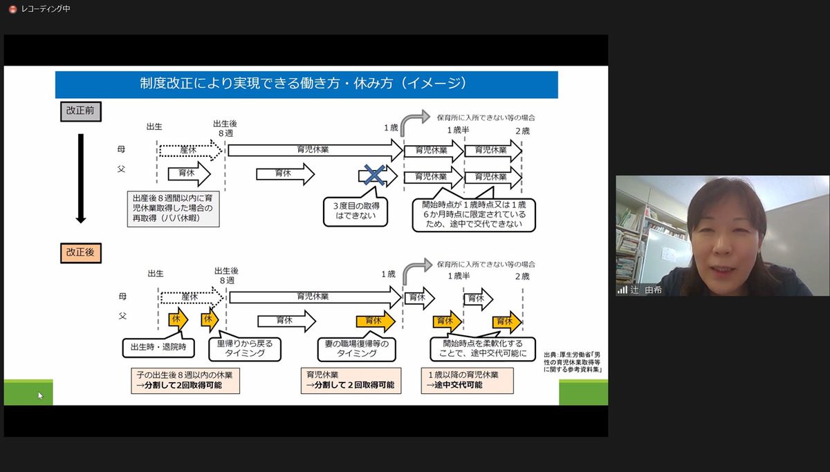 初めに、ユニバーシティビューローの辻由希シニアマネージャー(政治経済学部教授)があいさつし、企画趣旨や改正育児・介護休業法の詳細を説明。「法が施行されることで数週間、複数回に分けてなどこれまでより家庭の状況に合わせて柔軟に育児休業を取得しやすくなり、事業者側は、育児休業を取得しやすい雇用環境の整備や育児休業取得状況の公表などが求められます。本学としても、教職員の皆さんが働きながら子どもを産み育てやすい環境づくりに努めていきたいと考えています」と語りました。また、産休・育休取得経験のある医療技術短期大学事務室の職員の寺村絵美さんが、本学職員の育児休業取得状況を紹介し、「女性の取得率は高いけれど、男性職員はここ数年で少しずつ増えてきた状況です。職場全体での制度への理解と、取得しやすい環境の整備が必要」と話しました。