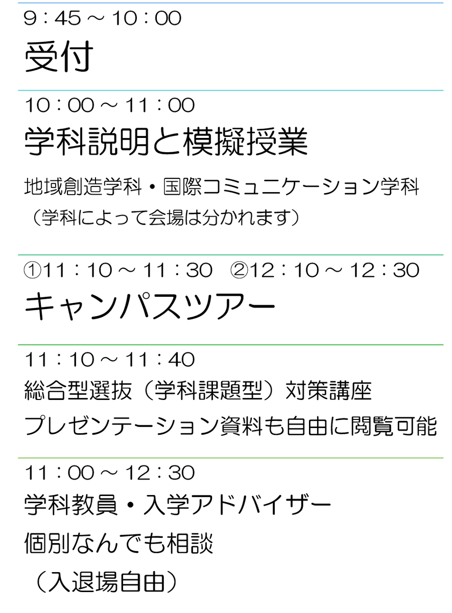 国際文化学部(地域創造学科、国際コミュニケーション学科)は来場型、生物学部(生物学科、海洋生物科学科)はオンライン型で実施します。