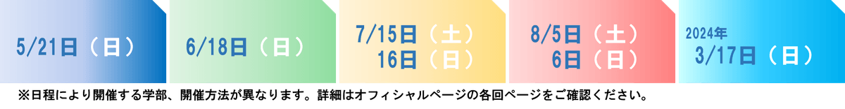 札幌キャンパスでは2023年度に5回のオープンキャンパスを開催予定です。日程により開催する学部、開催方法が異なります。今回のオープンキャンパスに参加予定の方はもちろん、みなさんのご都合に合わせて、ぜひこの後のオープンキャンパスにご参加ください。