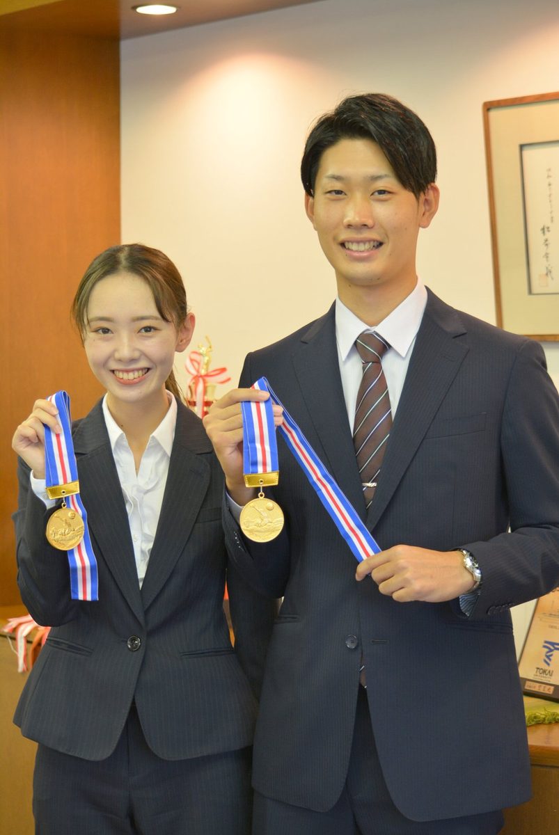当日は主将の平澤 輝選手(地域創造学科4年次生)、マネージャーの平塚 陽佳さん(国際コミュニケーション学科4年次生)が訪問。平澤選手は「多くの方々のご声援とご協力のおかげで優勝を勝ち取ることができました。自分も含め3人の野球未経験者がいましたが、自主性を重要視する練習方法で優勝できるチームを作り上げることができました。ご声援頂いた方はもちろんチームメイトにも感謝しています」と話しました。マネージャーの平塚さんは「コロナ禍で様々な制約がありましたが勝利の喜びをみんなで共有できたのが最高でした。私たちのチームは野球を楽しみたいと思う人なら誰でも歓迎します。選手はもちろんマネージャーも学年・性別・経験問わず、随時募集中なので、野球好きな人はいつでも気軽に入部してほしいです」と話しました。