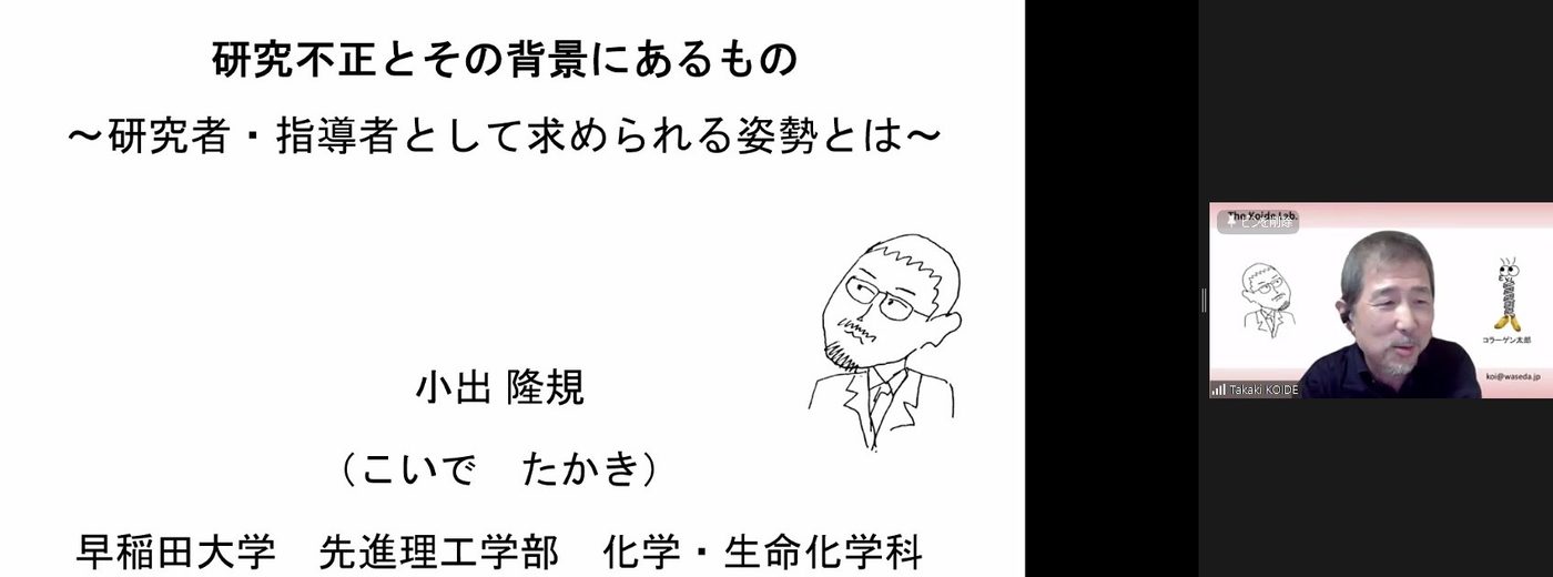 大学院健康科学研究科看護学専攻と本研究科FD委員会が9月14日に、教員を対象とした研究不正防止に関する特別講演会をオンラインで開催しました。研究倫理に対する意識を高めるとともに、公正な研究活動の推進・指導を徹底するために実施したものです。早稲田大学先進理工学部化学・生命化学科教授の小出隆規氏が、「研究不正とその背景にあるもの―研究者・指導者として求められる姿勢とは―」をテーマに講演し、本研究科をはじめ医学部看護学科や健康学部健康マネジメント学科、医療技術短期大学の教員ら約50名が聴講しました。