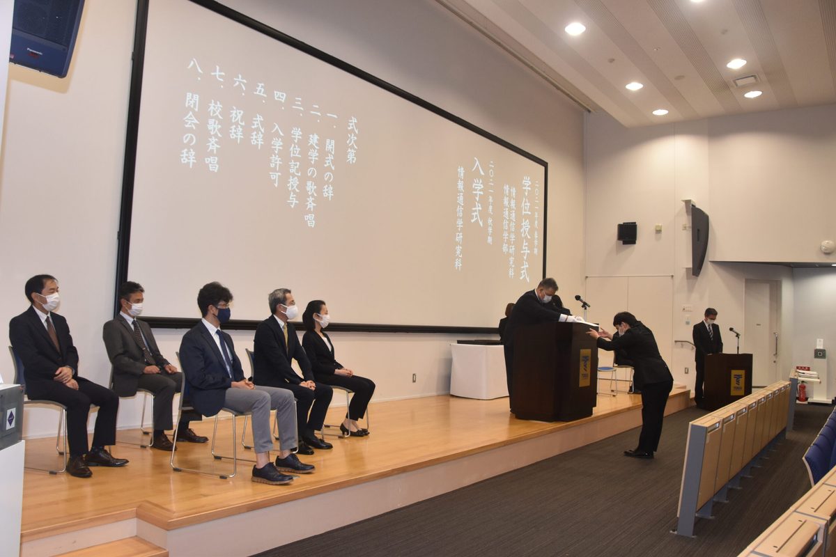 感染対策を徹底して行った式典では、情報通信学研究科の修了生に濱本和彦研究科長が学位記を、村山純一専攻長がメダルを授与し、情報通信学部の卒業生にも濱本学部長が学位記を手渡しました。式中には山田清志学長からのビデオメッセージがスクリーンに映し出され、「地球の温暖化や世界紛争、そして新型コロナウイルス感染症を含む世界の医療問題など、グローバルな視野による解決を必要とする課題はたくさんあります。皆さんにはぜひ東海大で培った知識や技術を生かし、地球市民としてこれらの課題解決に取り組んでいってもらいたい」と、修了生・卒業生を英語で激励するとともに、入学生に向けて、「在学中は心強い教員たちがサポートしますので、教養を身につけ研究に取り組み、困難なことにも積極的に挑戦してください」と祝辞が送られました。続いて濱本研究科長・学部長が登壇し、「修了生、卒業生の皆さんにお渡しした学位記は、社会に出るにあたり、東海大で何を学んだのかを証明するパスポートです。新型コロナの感染拡大により大変な状況が続いていますが、ピンチをチャンスに変え、今この状況だからこそできることに目を向けてみてください」とスピーチ。また、村山専攻長は、「研究とは既存の知識では解決できない課題に取り組むことであり、修了生、卒業生の皆さんは知恵を絞り課題解決に取り組んだことで、激変する社会にも適応する力が身についたと思います。大きな自信と誇りをもってください。また、入学生においては仲間と一緒に研究に励み、力を伸ばしてもらいたい。大きな研究成果を上げることを期待しています」と語りかけました。