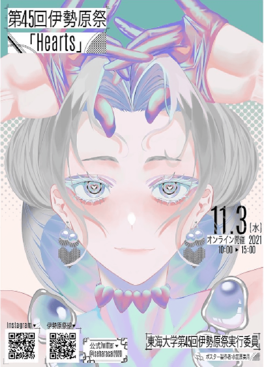伊勢原キャンパスでは11月3日にオンラインで「第45回伊勢原祭」を開催します。今回のテーマは「Hearts」。おもてなしや思いやり、温かい気持ちといった多くの「心」に思いをはせ、その一つひとつを大切にしようとの願いを込めました。