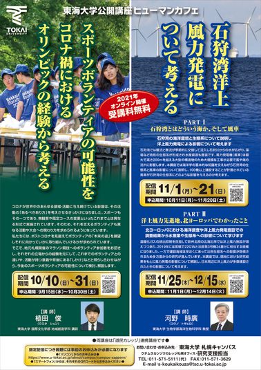札幌キャンパスでは、11月25日(木)~12月15日(水)にオンラインにて、東海大学公開講座ヒューマンカフェ(道民カレッジ連携講座)「石狩湾洋上風力発電について考える」のPARTⅡ「洋上風力先進地、北ヨーロッパでわかったこと」を開催します。生物学部海洋生物科学科の河野時廣教授が講師を務め、北ヨーロッパにおける海洋調査や洋上風力発電施設での調査結果から水産業や生態系への影響について学びます。