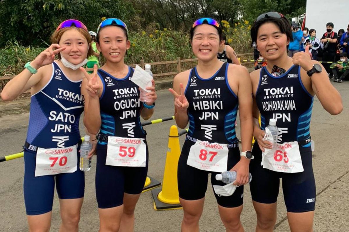 湘南キャンパスで活動する公認一般サークル「チームトライアスロンBOMBERS」が、10月16日に群馬県邑楽郡板倉町の渡良瀬遊水地で開かれた日本学生トライアスロン選手権(インカレ)渡良瀬大会に出場。女子が昨年に続き団体戦で準優勝しました。新型コロナウイルス感染症拡大の影響で、当初、9月5日に予定されていた日本学生トライアスロン選手権・観音寺大会が延期され、感染対策を徹底し無観客で開催された本大会は、スイム1.5km、バイク40km、ラン10kmの合計51.5kmで争われ、BOMBERSからは女子の日引華子選手(体育学部3年次生)、小早川碧海選手(文学部3年次生)、小口愛海選手(健康学部2年次生)、佐藤らら選手(文化社会学部1年次生)、男子の小泉諒太選手(教養学部3年次生)、紺野涼太選手(健康学部3年次生)が出場しました。