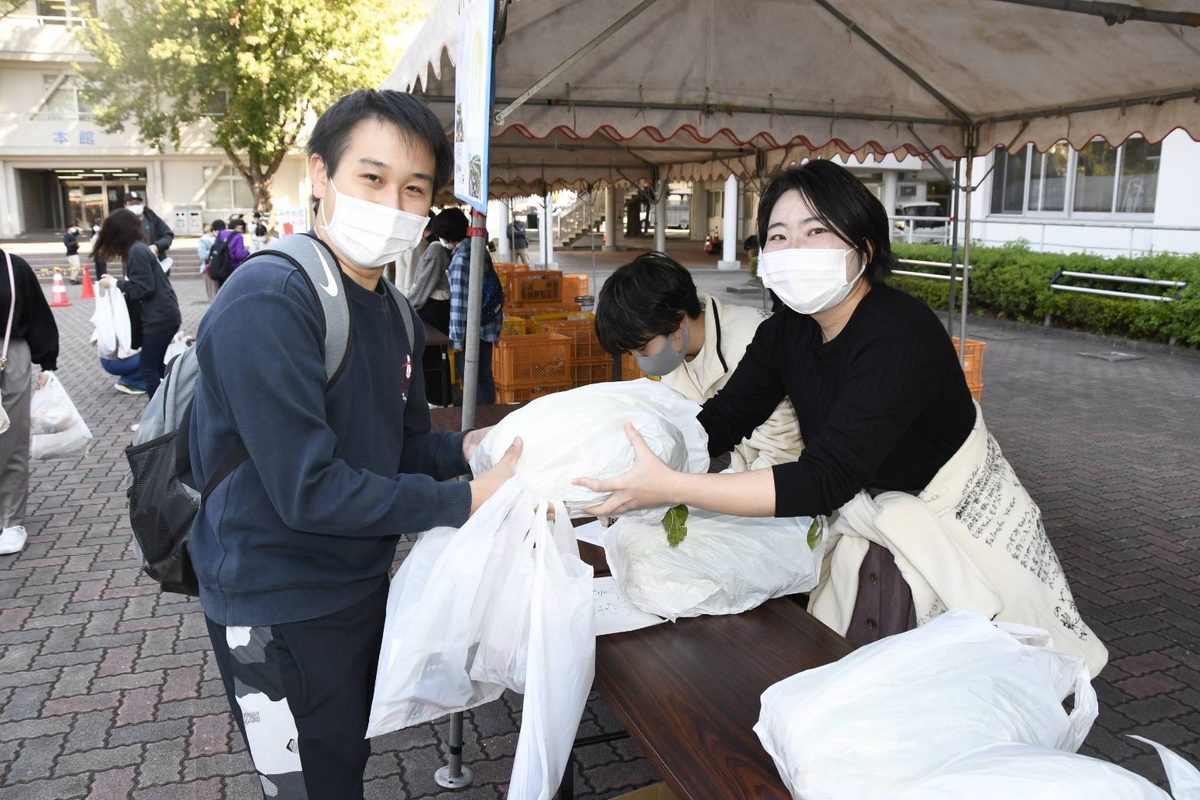 1、2日目は学生を対象にしたビンゴ大会を開催し、座席数を限定するなど感染防止対策を整えた会場は満席となる盛況ぶりでした。また、各学科の学びや熊本キャンパスを拠点に活動するスチューデントアチーブメントセンター・チャレンジプロジェクトの活動を紹介する展示ブースを巡る「スタンプラリーを集めて学食カレーをget!」も実施しました。3日目には、阿蘇実習フィールドで収穫・加工した野菜やベーコンの販売・無料配布も開催。実行員会のメンバーが10月から何度も阿蘇実習フィールドに足を運んで収穫をしてきた食材を受け取った学生や教職員は、「毎回とても楽しみにしていたので、復活してくれてうれしい」「家に帰って食べるのが楽しみ」と笑顔を見せていました。農産ブースを担当した古家怜賀さん(農学部3年次生)は、「野菜や加工食品の販売・配布は欅祭の名物。昨年度は実施できずとても残念でしたが、この伝統を後輩たちに引き継ごうと学部・学年の垣根をこえて一体となりながら準備を進めてきました。1、2年次生も雰囲気を感じるとともにやりがいも感じてくれたと思うので、ぜひ来年度以降は地域の方々にも食材が届けられるようにしたい」と充実した表情を見せていました。