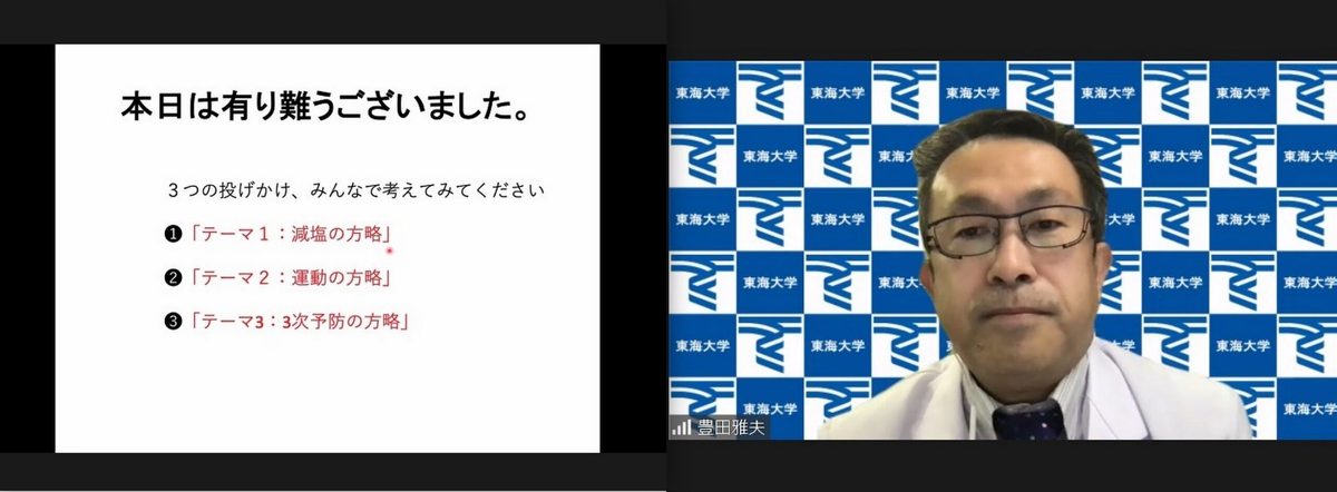 医学部の学生が、健康学部健康マネジメント学科が11月25日にオンラインで開催した2021年度第1回KENKOセミナー「学部をまたいで予防について考えてみませんか!?」に参加しました。QOL向上を目指して健康を多角的・多面的にとらえた活動を展開している東海大学KENKOプロジェクトと健康学部が共催し、学生や教職員の健康とよりよい環境づくりのために正しい知識を身につけてもらおうと開いているものです。今回は、初めて本学部と医学部の学生を対象に実施。両学部の学生約20名が、医学部医学科の豊田雅夫准教授(医学部付属病院腎内分泌代謝内科第一診療センター長)と健康学部の森真理准教授の講演を聴講し、グループディスカッションで学びを深めました。