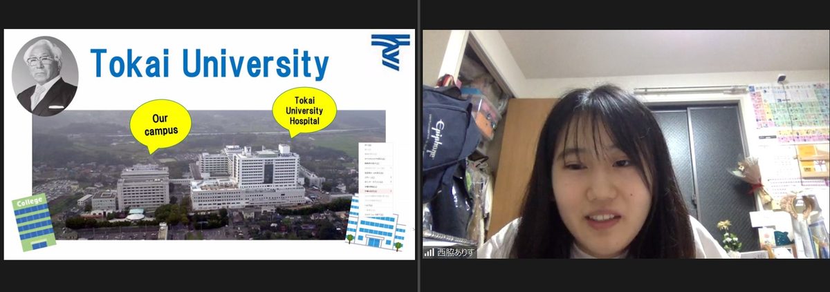 参加者全員の自己紹介に続き、本学科の西脇ありすさん(2年次生)が、伊勢原キャンパス内の施設や学生生活、医学部付属病院をはじめ、日本の伝統文化について紹介。室井優貴子さん(同)は、本学科のカリキュラムや日本の看護制度などについて説明しました。その後、同カレッジの学生3名が動画でキャンパスを紹介し、Q&A方式でデンマークの看護教育や医療制度の特徴について説明。終了後には活発な質疑応答や意見交換を行いました。