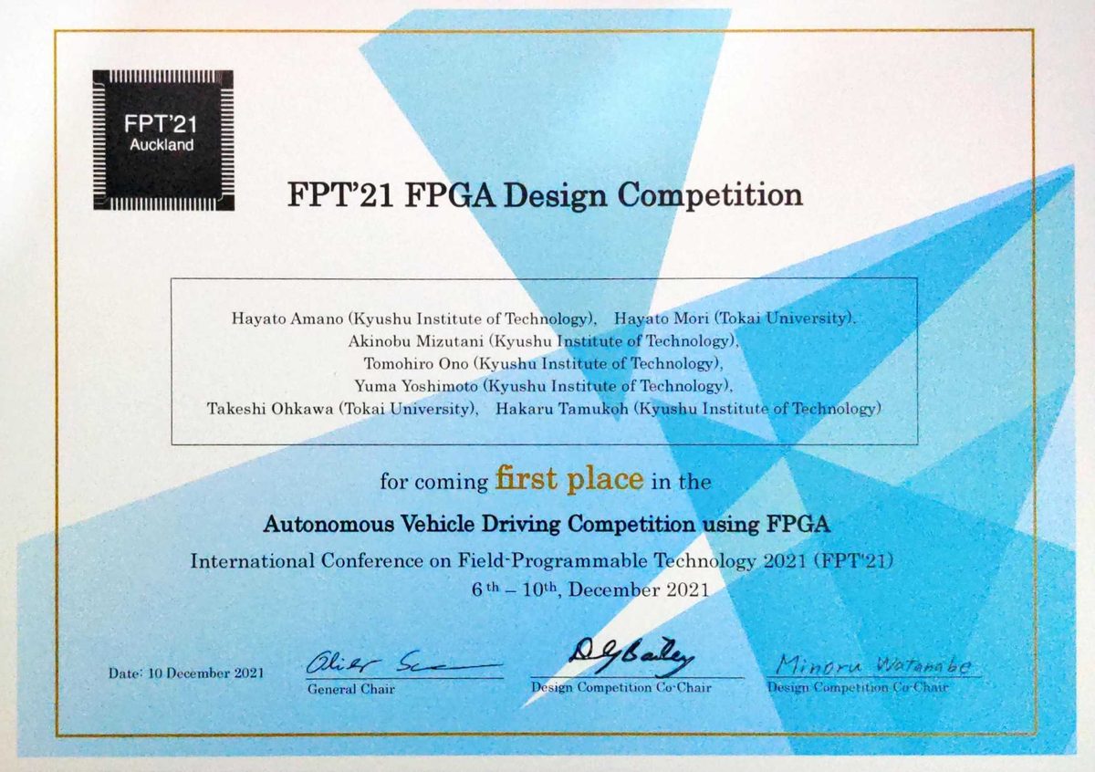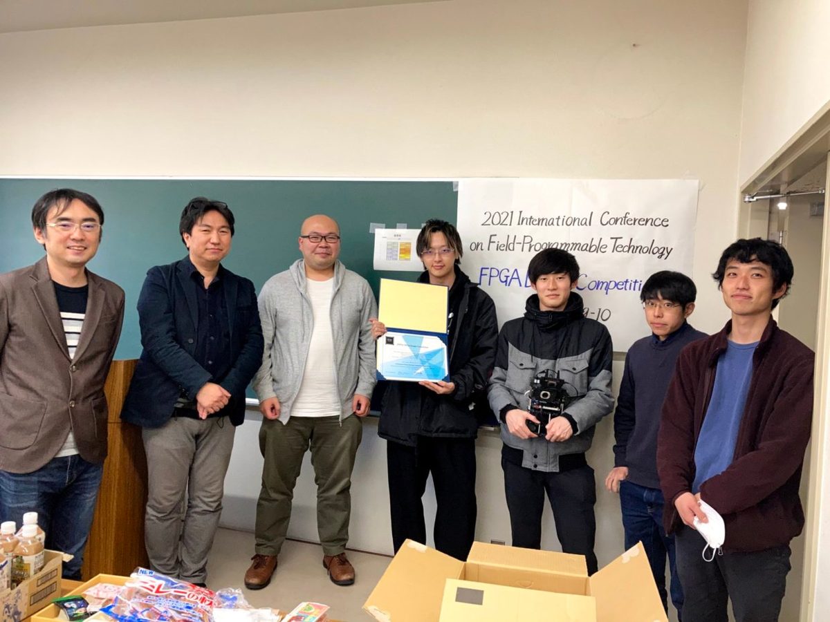 2021年12月10日、ニュージーランド オークランドを拠点にオンライン開催された再構成可能デバイスに関する国際学会International Conference on Field-Programmable Technology 2021 (FPT’21) のFPGA Design Competitionに、本学情報通信学部 組込みソフトウェア工学科 大川研究室と九州工業大学大学院 生命体工学研究科 田向研究室の学生が中心となって結成しているチーム「Ultra_Bot」(指導教員:本学情報通信学部組込みソフトウェア工学科 大川 猛 准教授、九州工業大学大学院生命体工学研究科 田向 権 教授)が出場しました。今年度結成された本チームは、10月に開催された「第10回 相磯秀夫杯 FPGAデザインコンテスト」に続いて本競技会でも優勝し、2連覇という快挙を成し遂げました。