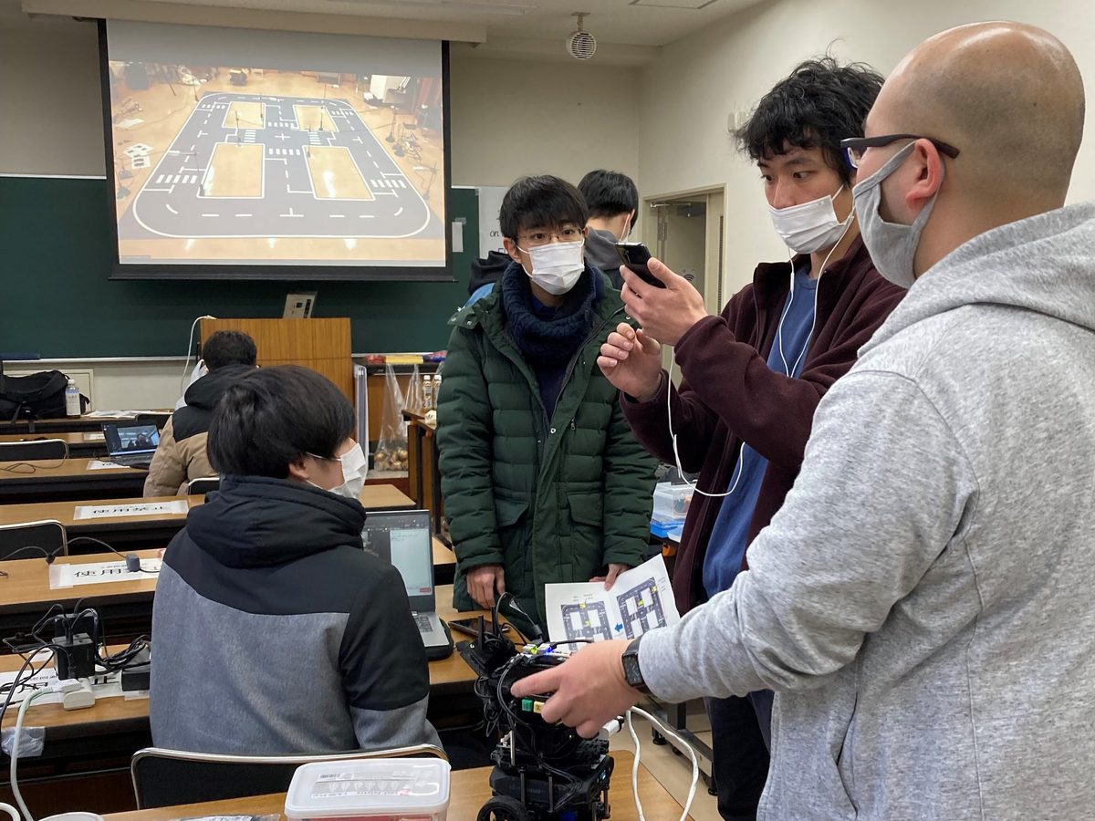 なお、本競技会は新型コロナウイルス感染対策を十分に講じたうえ、現地参加メンバーと遠隔参加メンバーが混在するハイブリッド形式での開催となりました。遠隔参加者との公平を期すため、現地参加者は現地の学生スタッフによるサポートの下、コースが設置された部屋とは離れた部屋から英語でのコミュニケーションによるテスト走行やロボットの調整などが求められました。