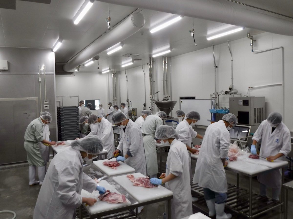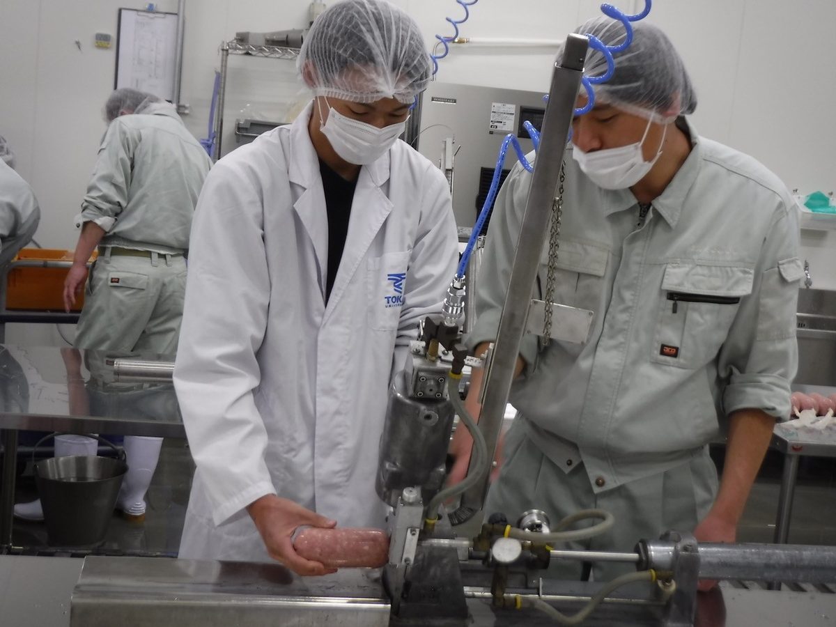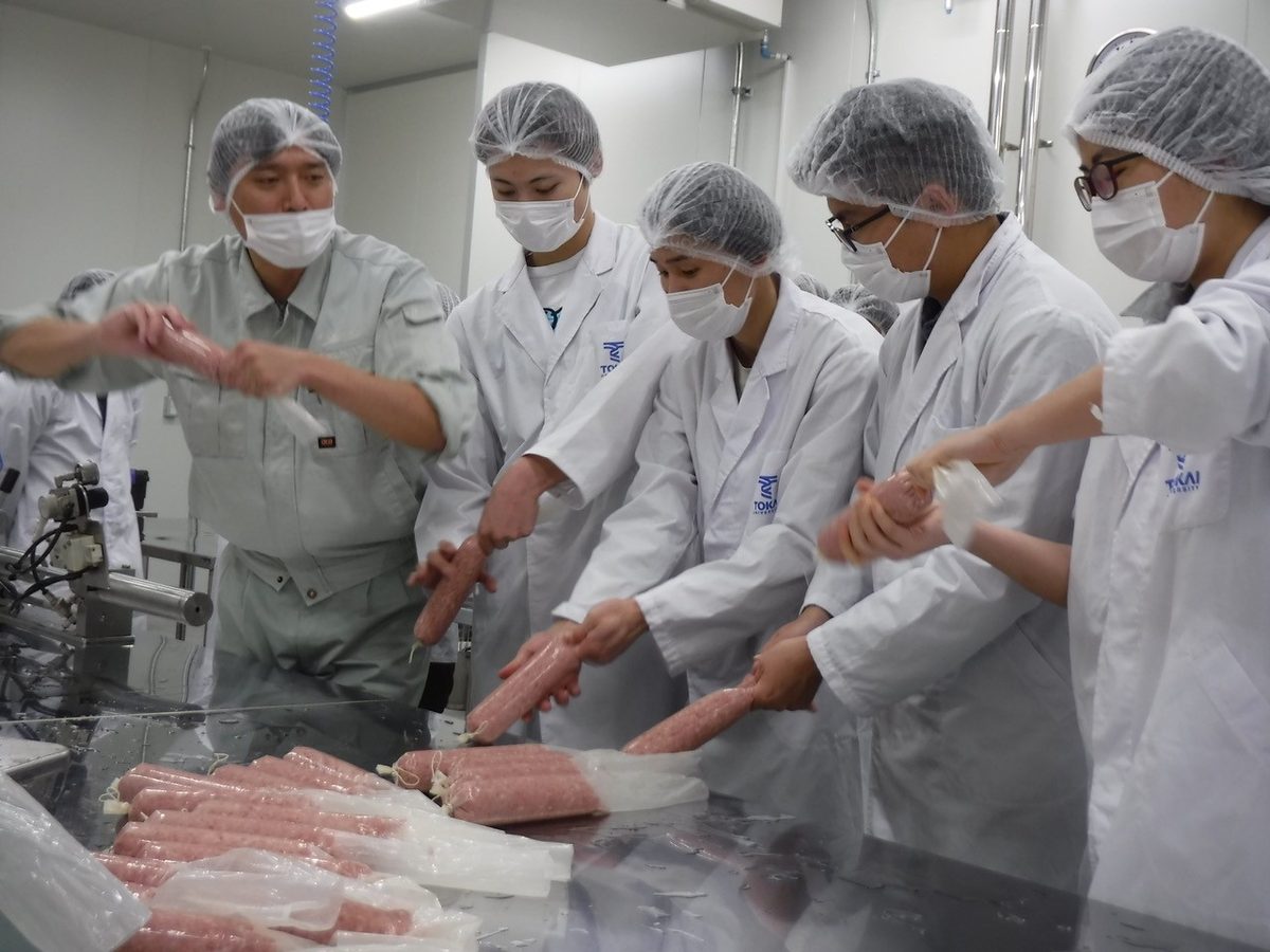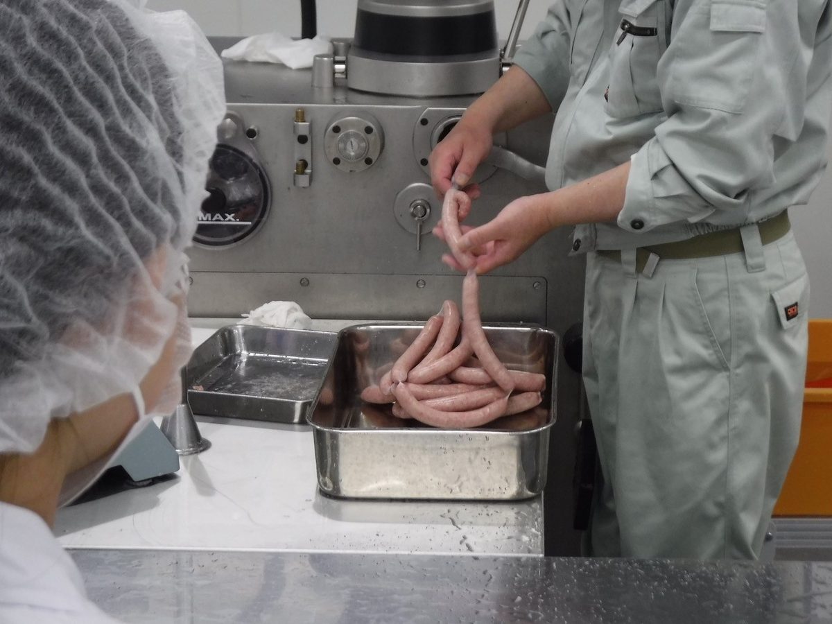 受講生らは2つのグループに分かれて、5月9日と16日、23日と30日に、ボロニアソーセージとウインナーソーセージの製造を行いました。この実習では肉処理、塩漬、充填操作を通して、発色剤、酸化防止剤、調味料、結着補助剤などの添加物の役割について理解を深めました。