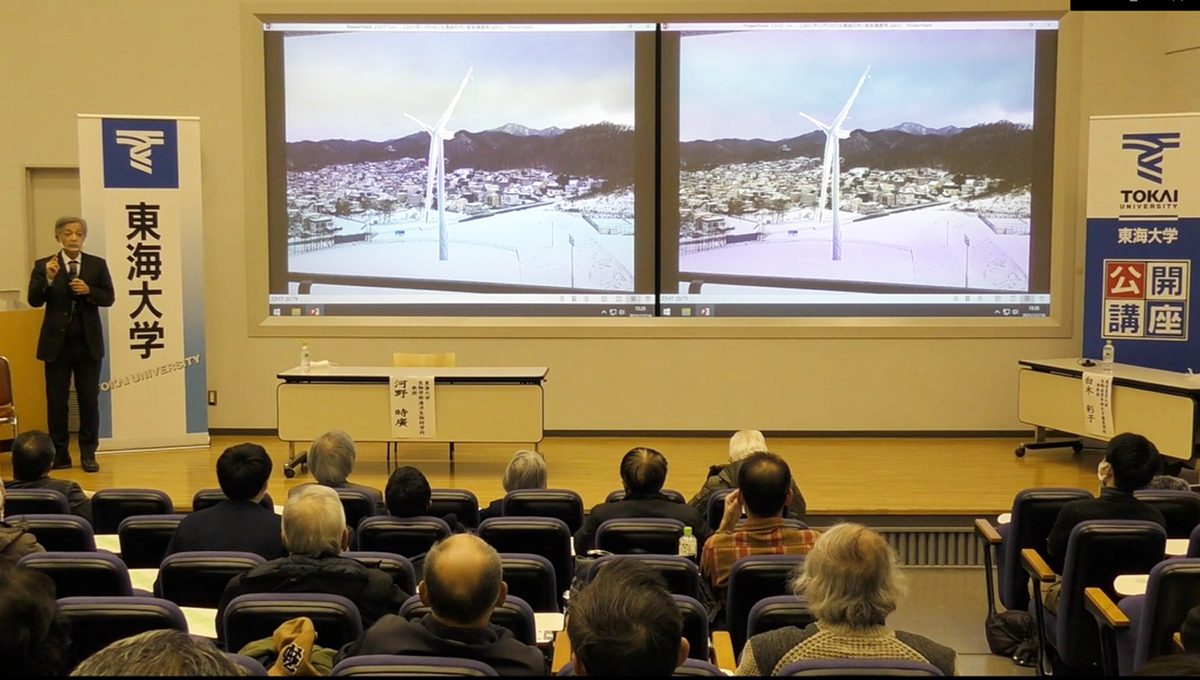 札幌キャンパスでは11月、12月にオンラインと対面で、東海大学公開講座ヒューマンカフェ(道民カレッジ連携講座)「石狩湾洋上風力発電について考える」を全3回に分けて開催しました。生物学部海洋生物科学科の河野時廣教授が講師を務め、石狩湾の海洋環境と生態系や、洋上風力発電による影響について解説しました。