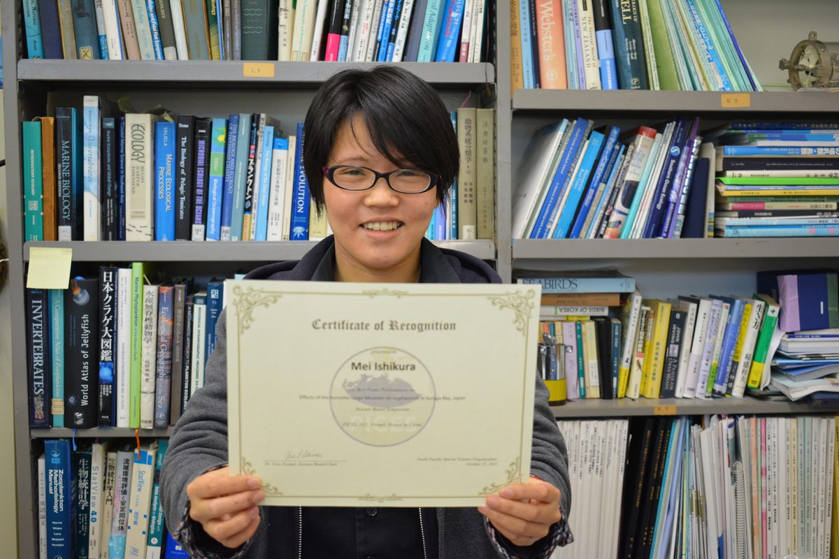 大学院海洋学研究科2年次生の石倉明依さん(指導教員=海洋生物学科・西川淳教授)が、昨年10月29日にオンラインで開催された国際研究集会「PICES-2021(北太平洋海洋科学機関2021年次会合)」で最優秀ポスター発表賞(Best Poster Presentation Award)を受賞しました。