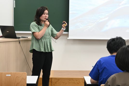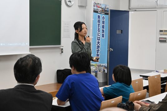海洋学部水産学科の李銀姫准教授の研究室では、5月12日に静岡キャンパスで講演会「海苔漁師と考える日本の海×海業の可能性」をテーマに講演会を開催しました。小規模漁業に関する研究を展開する本研究室では、李准教授と学生たちが実際に静岡県内外の漁村に足を運びながら現状を把握するとともに、課題解決に向けた情報発信を進めています。今回の講演会では、宮城県東松島市の海苔漁師・相澤太氏(アイザワ水産代表)と同市を拠点に子どもたちへの自然教育を進める成澤みく氏(ODYSSEY代表理事)が、小規模漁村の現状や未来について語りました。