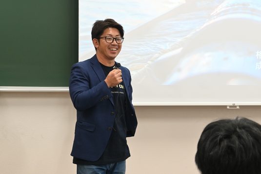 当日は、李准教授の授業を受講する学生や静岡県内の漁業関係者ら約100名が参加。相澤氏は、「日本では海苔の漁獲量が減少する中、海外からは安価で輸入できるようになっています。技術を抱えるだけでは衰退していくと考え、日本各地で海洋環境と食に関するワークショップなどを開催するようにもなりました。最も大切なことは、食べる人に喜んでもらえる海苔をつくりたいという気持ちであり、これからも世代を超えて多くの人々と意見を交換しながら、日本の漁業の発展に貢献していきたい」と話しました。成澤氏は、東松島市に生まれ、アメリカハワイ大学マノア校平和紛争解決学部に留学しながらパールハーバー国立記念館などで国際平和教育事業に従事してきた経歴を紹介。12歳の時に東日本大震災を経験したことから、現在は同市のサケ漁師と連携しながら小規模漁業の持続可能性や海洋人類学について平和学の視点から検討しており、「人類が海と共存し続ける豊かな未来を築けるよう研究活動を続けていきたい」と語りました。