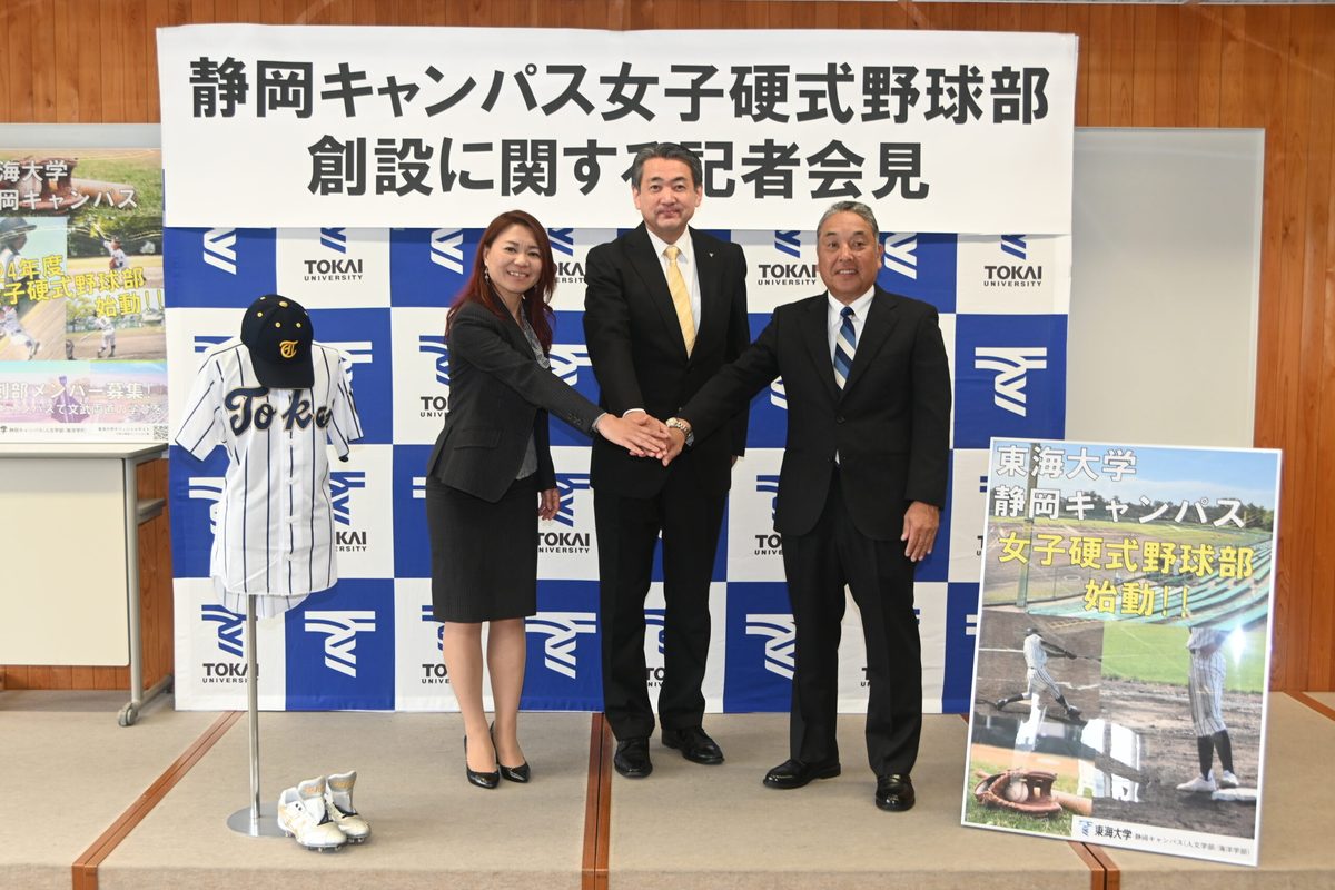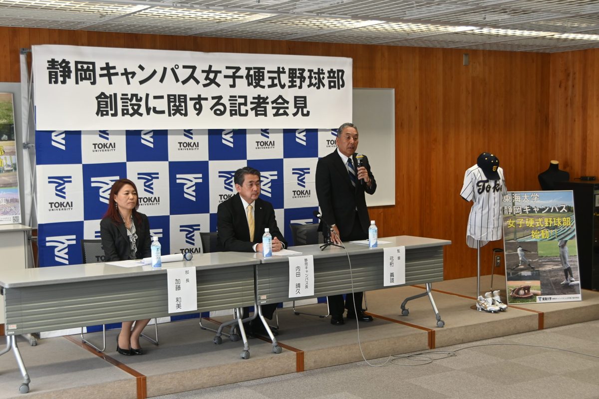 記者会見では内田晴久静岡キャンパス長、女子硬式野球部部長就任予定の加藤和美准教授(海洋学部)、監督就任予定の弓桁義雄教諭(静岡翔洋高中等部)が登壇。初めに内田キャンパス長が、「学生たちが主体的に取り組み、多様な経験を積むことは、社会に出て活躍していくうえで役に立つと考えています。野球をやりたいという女子学生が静岡で大いに活躍し、地域活性化という意味でも大きな役割を果たしてくれると期待しています。ぜひ地域の皆さまにも応援をお願いしたい」と創設の経緯を語りました。続いて加藤准教授は、「英語教員として勉学の面でもサポートし、文武両面で学生たちを支えていきたい。全国から入学してくる学生たちとたくさんの思い出をつくっていけるのではとワクワクしています」と話しました。静岡翔洋高女子硬式野球部の監督も務める弓桁教諭は、「静岡翔洋高に女子硬式野球部を創設して4年目を迎え、3名で発足したチームが今では81名の部員が所属する全国でも屈指の人数を誇るチームに成長しました。当初の想像を遥かに超え、こんなにも野球をやりたい生徒がいるんだと感じています。大学や社会人で野球を続ける環境はまだまだ少ない中で我々東海大学がその任を果たし、プロや指導者を目指す学生を育てるとともに、野球を通して社会で活躍できる人材を育成していきたい」と意気込みを語りました。
