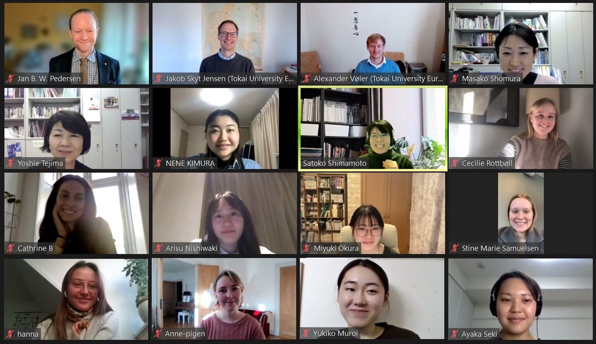 医学部看護学科では1月14日に、デンマーク・デアコネス大学看護学部とオンライン研修会「University College Diakonissestiftelsen & Tokai University Virtual Visit」を実施しました。本学科では2016年8月に同学部と学術交流協定を締結し、学生らが互いに訪問し合って交流を図っています。この研修会は、新型コロナウイルス感染症の拡大を受けて中止となったデンマーク医療福祉研修に替えて開いたものです。当日は双方の学生と教員、東海大学ヨーロッパ学術センターのスタッフら約20名が参加し、学生の英語によるプレゼンテーションや意見交換を行いました。